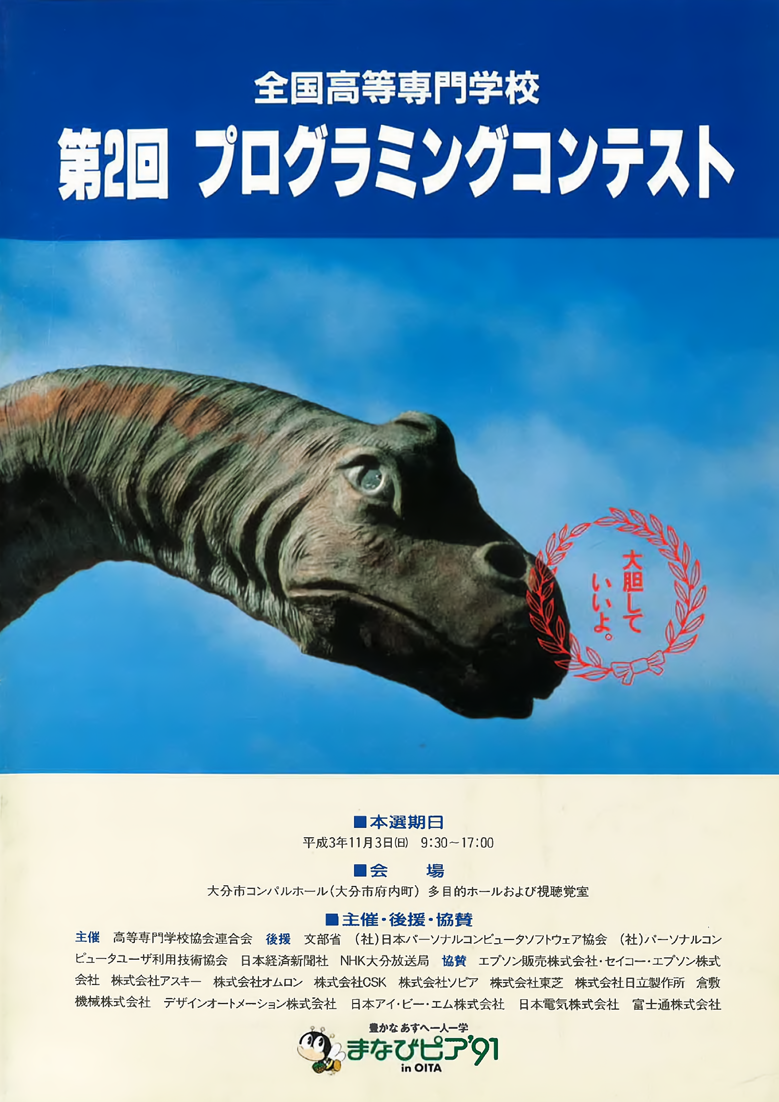 第2回 全国高等専門学校プログラミングコンテスト 大分大会|1991主管校 沼津工業高等専門学校 大胆していいよ 募集部門 課題CAI用のソフトウェア 予選 1991 9/23 月 本選 1991 11/3 日 会場 大分コンパルホール(大分市)大分県大分市府内町1丁目5番38号 本選結果 第2回大分大会 課題部門|自由部門 本選結果 スケジュール 募集要項公開 4月上旬 予選出場申込期間 5月中旬~下旬 予選 平成3年9月23日(月) 本選 平成3年11月3日(日) 資料ダウンロード パンフレット 第2回大会パンフレット(4MB)PDFダウンロード 大会日程 第2回全国高等専門学校プログラミングコンテスト大会日程PDFダウンロード