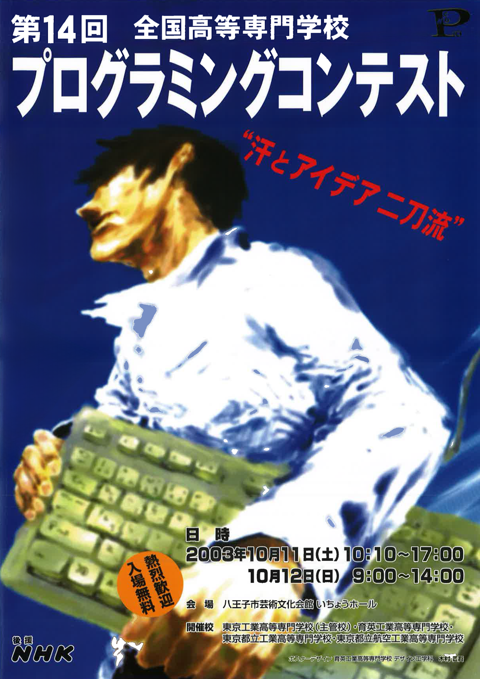 第14回 全国高等専門学校プログラミングコンテスト 東京大会|2003主管校 東京工業高等専門学校 汗とアイデア二刀流 募集部門 課題部門スポーツとコンピュータ 自由部門自由なテーマで独創的な作品 競技部門与えられたルールによる対抗戦 「達人に隙なし」 予選 2003 6/28 土 本選 2003 10/11 土 12 日 会場 八王子いちょうホール東京都八王子市本町24−1 本選結果 第14回東京大会 課題部門 自由部門 競技部門 全部門の本選結果 放送予定 第14回プログラミングコンテスト スケジュール 募集要項公開 平成15年4月上旬 予選出場申込期間 平成15年5月中旬〜下旬(1週間) 予選 平成15年6月28日(土) 本選 平成15年10月11日(土) ~10月12日(日) 資料ダウンロード 募集要項部門のご案内 課題部門PDFダウンロード 自由部門PDFダウンロード 競技部門PDFダウンロード 予選結果 自由部門予選通過テーマPDFダウンロード 競技部門予選通過チームPDFダウンロード 実施要項 実施要項一式ダウンロード(PDF)PDFダウンロード パンフレット 第14回大会パンフレット(8MB)PDFダウンロード