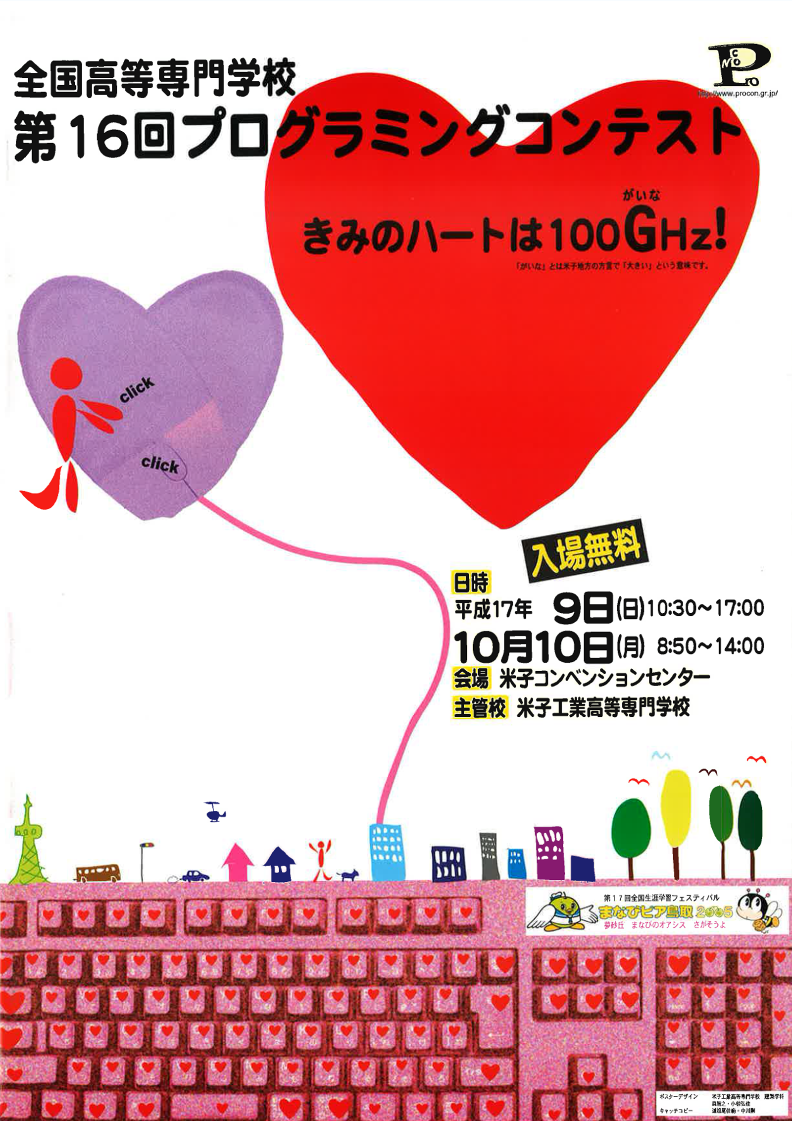 全国高等専門学校第16回プログラミングコンテストを開催します。本コンテストは高専学生が、情報処理技術において優れたアイデアと実現力を競うものです。今大会は、課題部門・自由部門・競技部門の3部門で競っていただきます。
