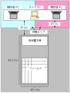 また、マス目に区切られたフィールドの外には、図2のように片付けた物体を置く場所と、コンピュータ等を置くためのテーブルが配置されます。