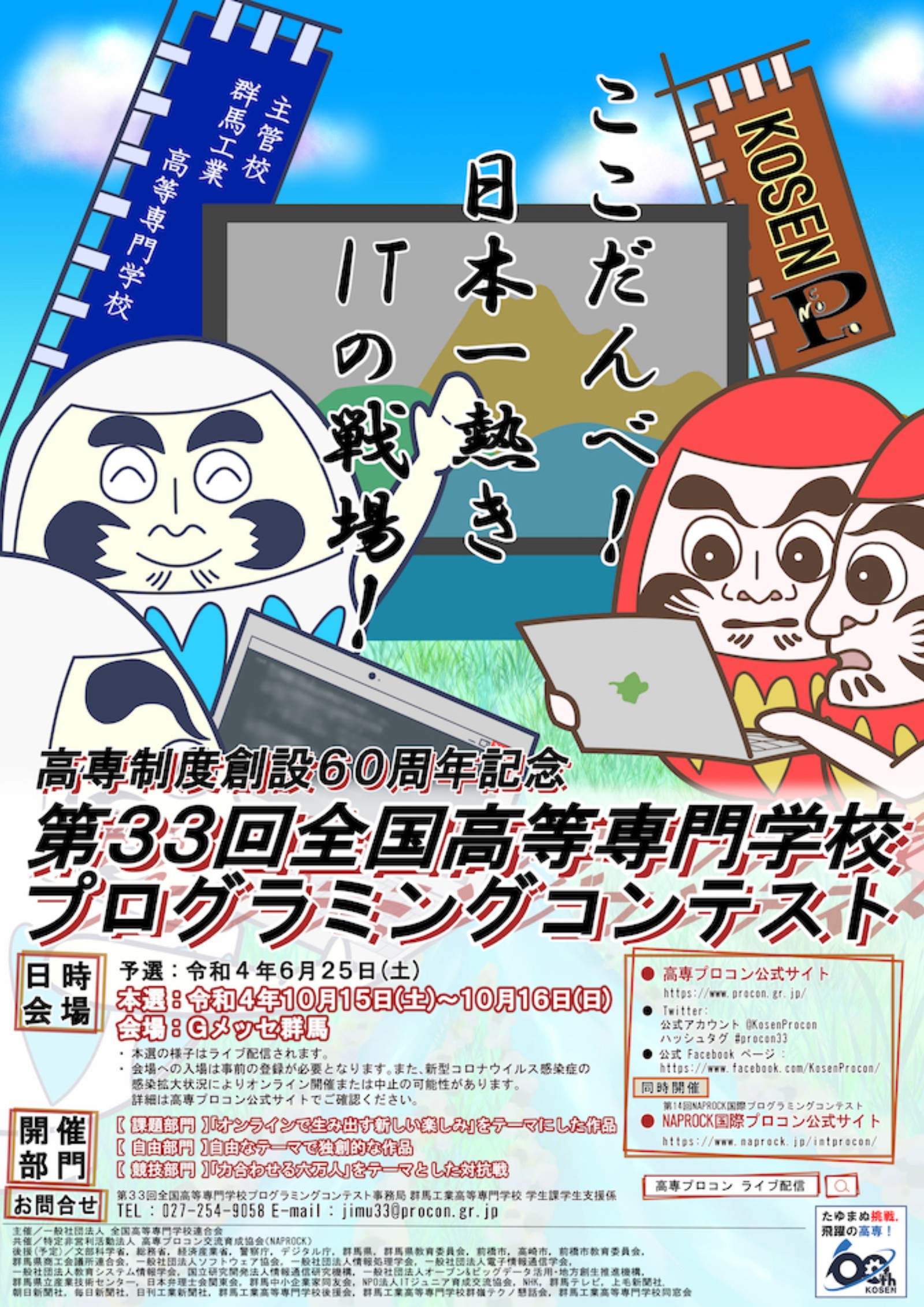 下記の要領で第33回全国高等専門学校プログラミングコンテストを開催致します。本コンテストは,高専生が日ごろの学習成果を活かし,情報通信技術におけるアイデアと実現力を競うものです。今大会は課題部門・自由部門・競技部門の3部門で作品を募集します。