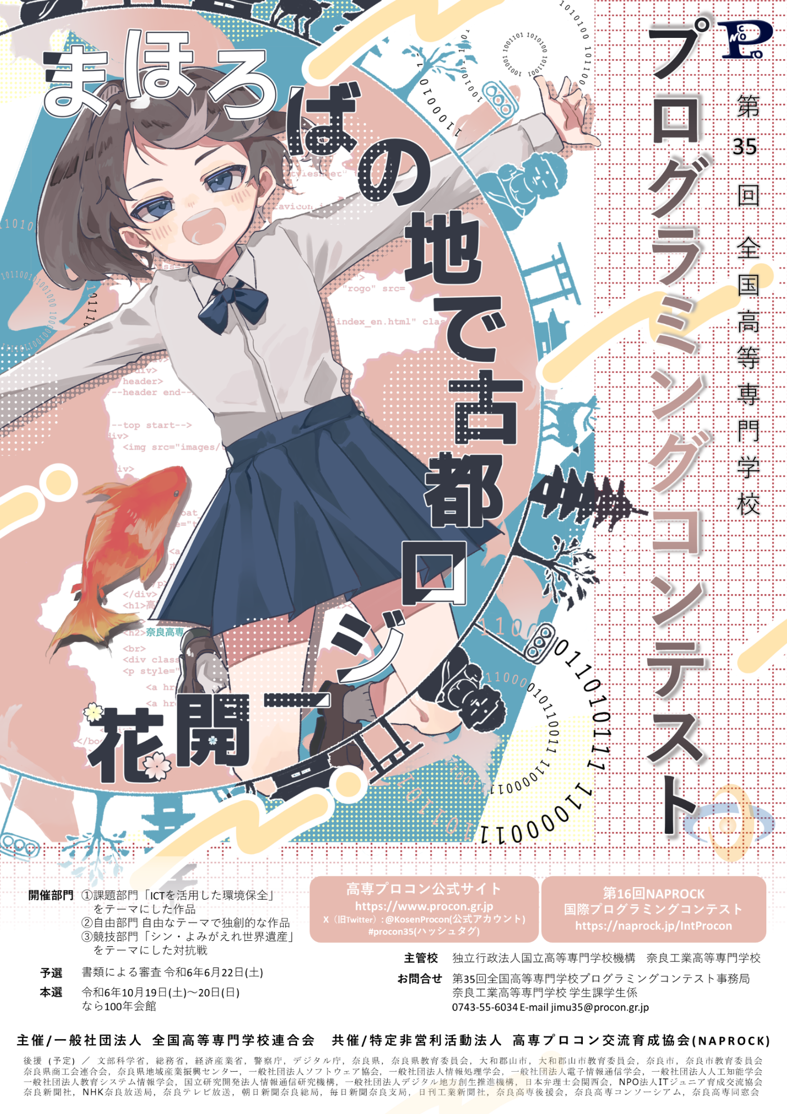 下記の要領で第35回全国高等専門学校プログラミングコンテストを開催いたします。本コンテストは,高専生が日ごろの学習成果を活かし,情報通信技術におけるアイデアと実現力を競うものです。今大会は課題部門・自由部門・競技部門の3部門で作品を募集します。