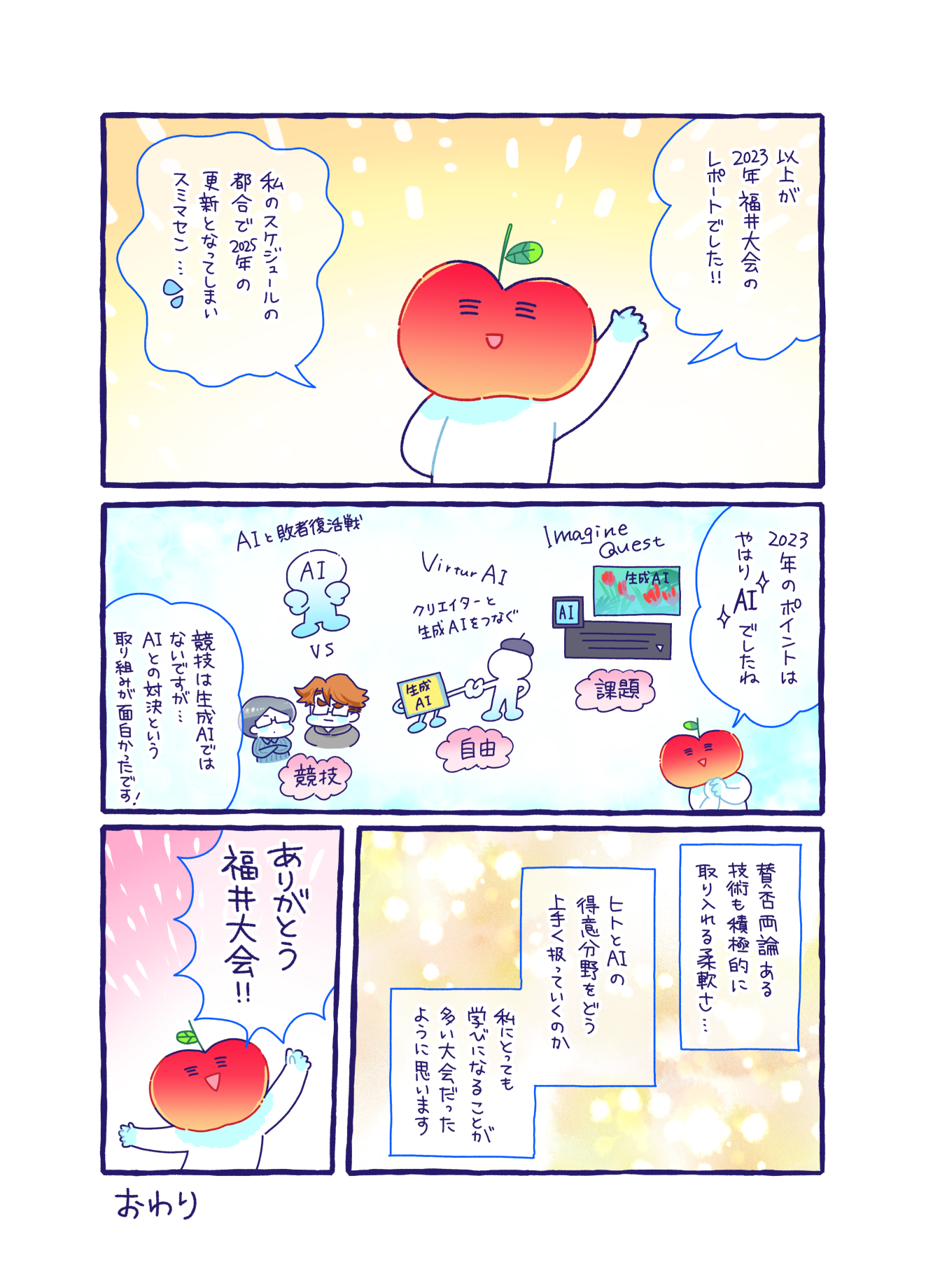 少し遅れてのレポート漫画となりましたが、生成AIが一般の人にも手軽に使えるようになりはじめたころの空気感を思い出したりなどしていただければ幸いです。」