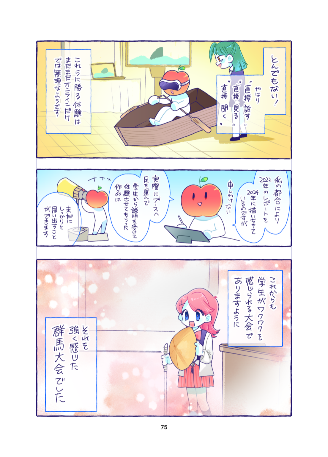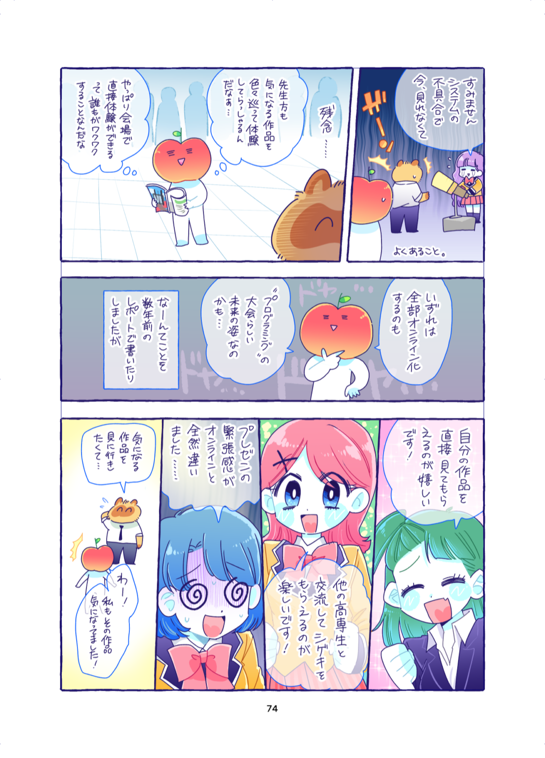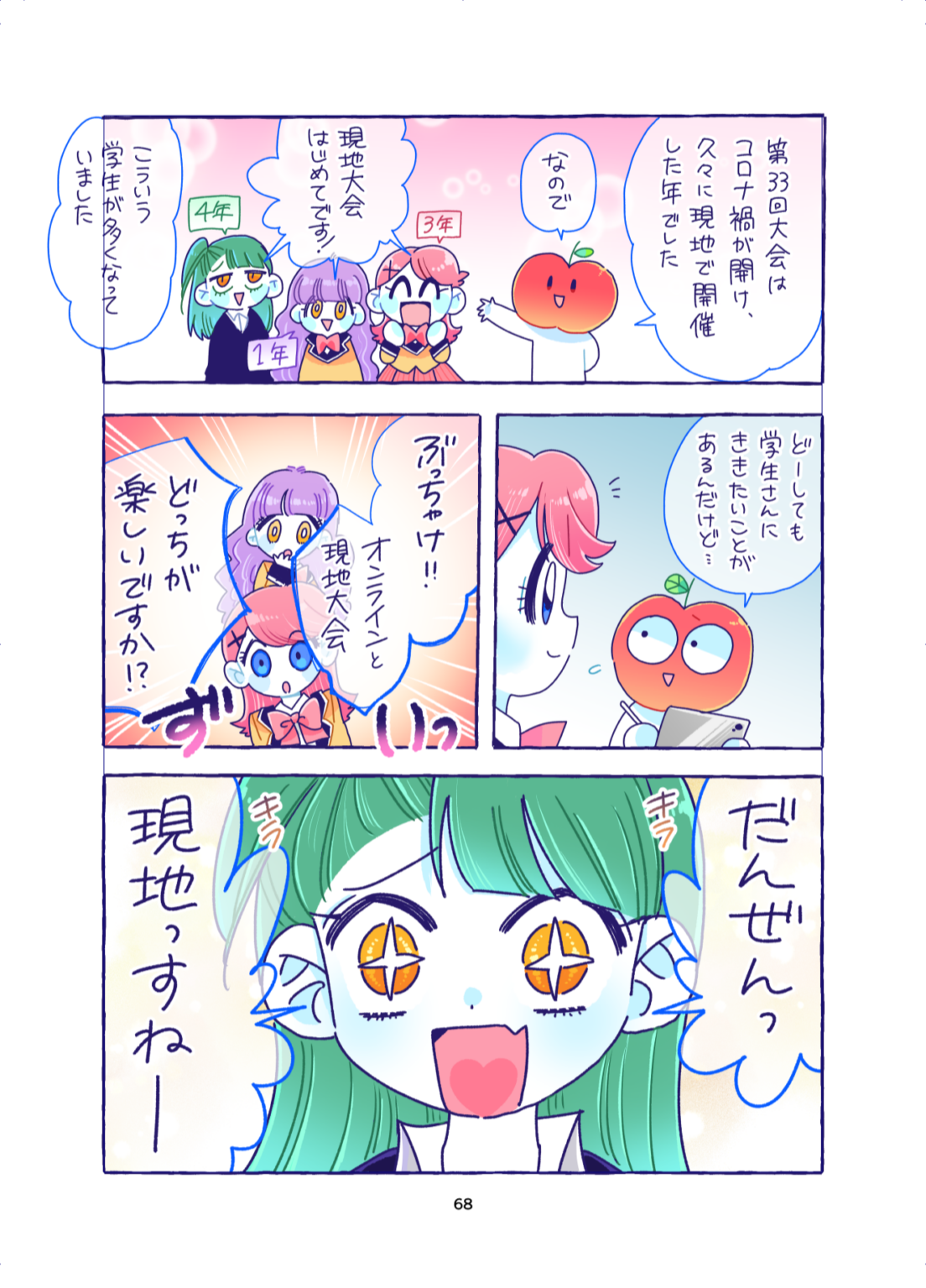 プロコン漫画 トップページ> プロコン漫画 > プロコンレポート2022 第33回群馬大会③ プロコンレポート2022 第33回群馬大会③ メッセージ 「大変お待たせしてしまい申し訳ございません。 群馬大会のレポートはこれで最後となります。 久々の現地大会ということもあって、直に作品を見ることの楽しさを思い出すことのできる大会でした。 学生の熱意に直接触れることも久々だったため、とても楽しかったことが強く印象に残っております。 やっぱりこういう大会はオンラインだけではなく現地に行ってこそだなあと痛感した年でした。」