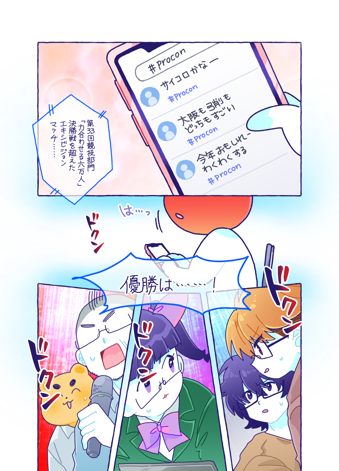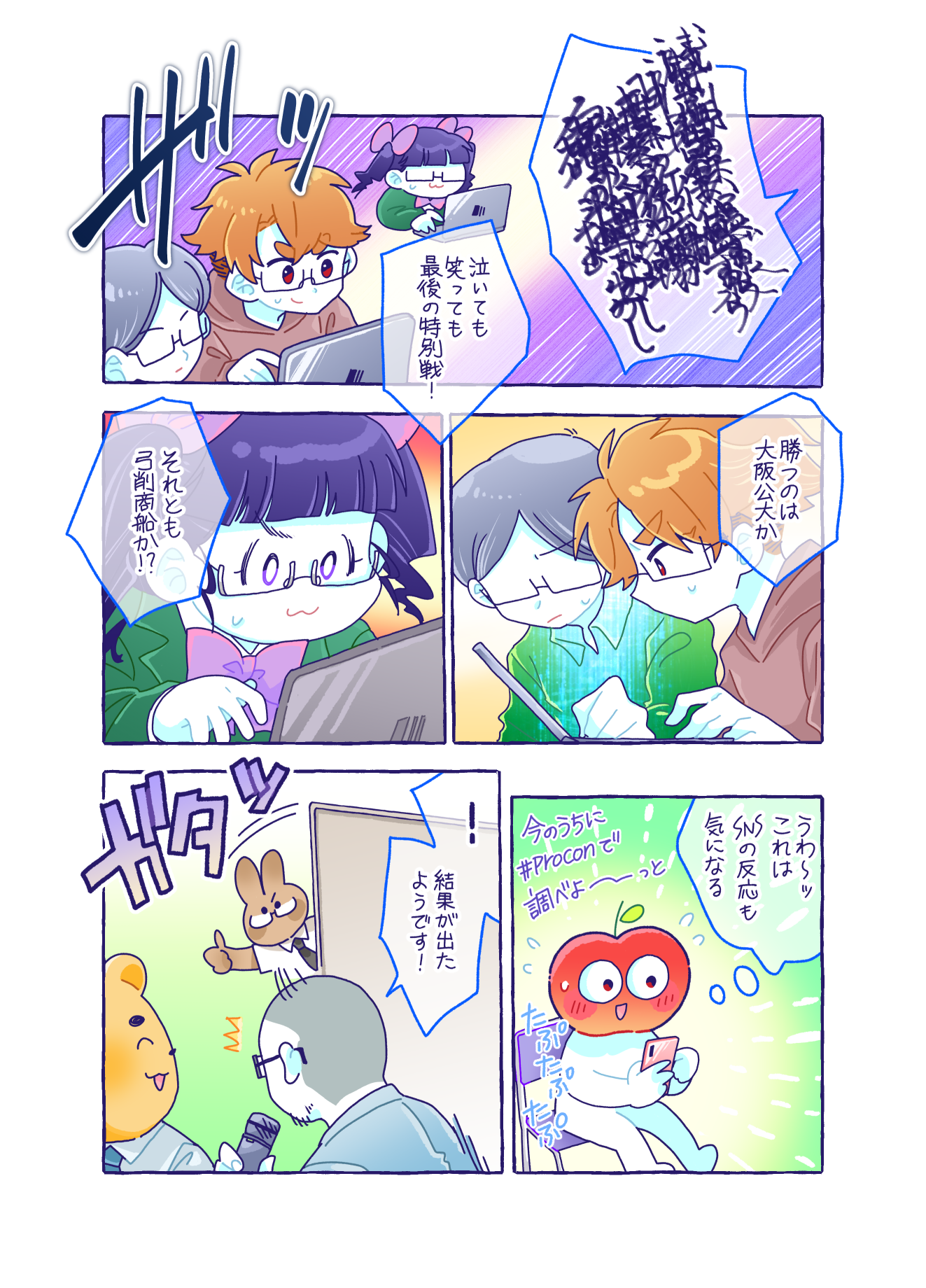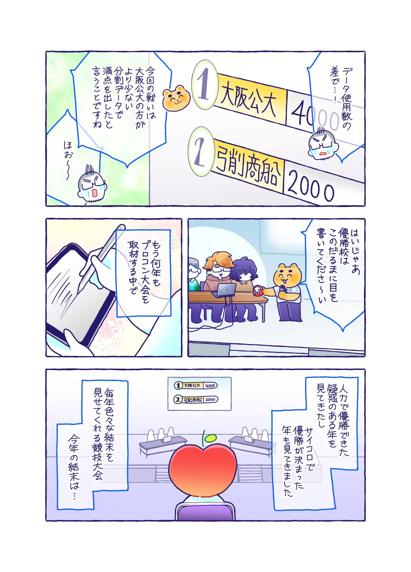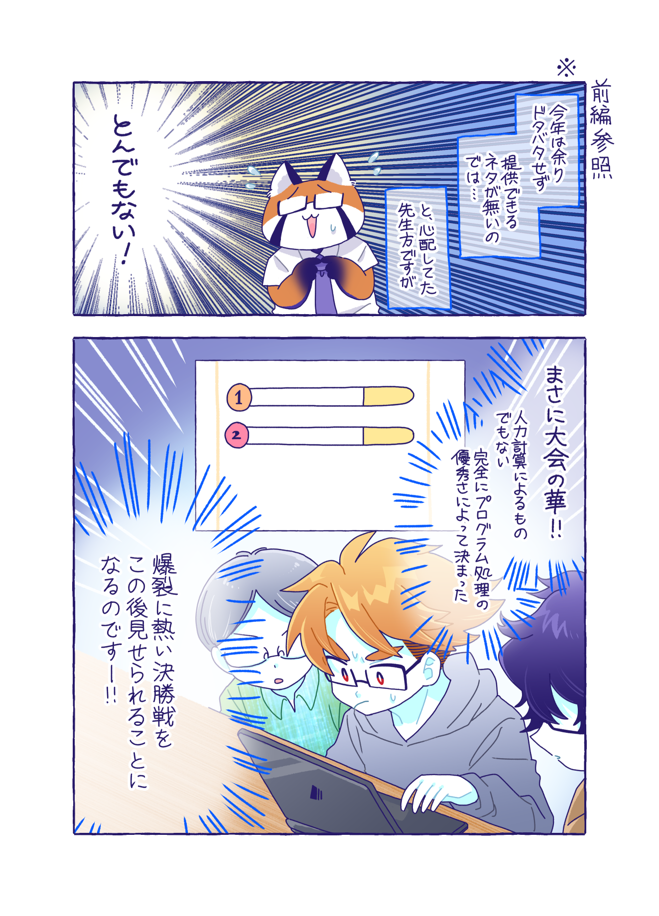 プロコン漫画 トップページ> プロコン漫画 > プロコンレポート2022 第33回群馬大会② プロコンレポート2022 第33回群馬大会② メッセージ どうも。メロコです。 執筆が遅くなり、2022年のレポート漫画になりますが、当時を思い出しながら楽しんでいただけると嬉しいです。 実際にこの試合を見ながらとてもワクワクしたのを2年経っても覚えております。 私はTwitter(現X)をチェックしつつリアルタイムでの感想を感じながら試合を観るのがとても好きです。その感覚が伝わればと思っております。 2年越しのメッセージですが、大阪公大高専さんおめでとうございました。