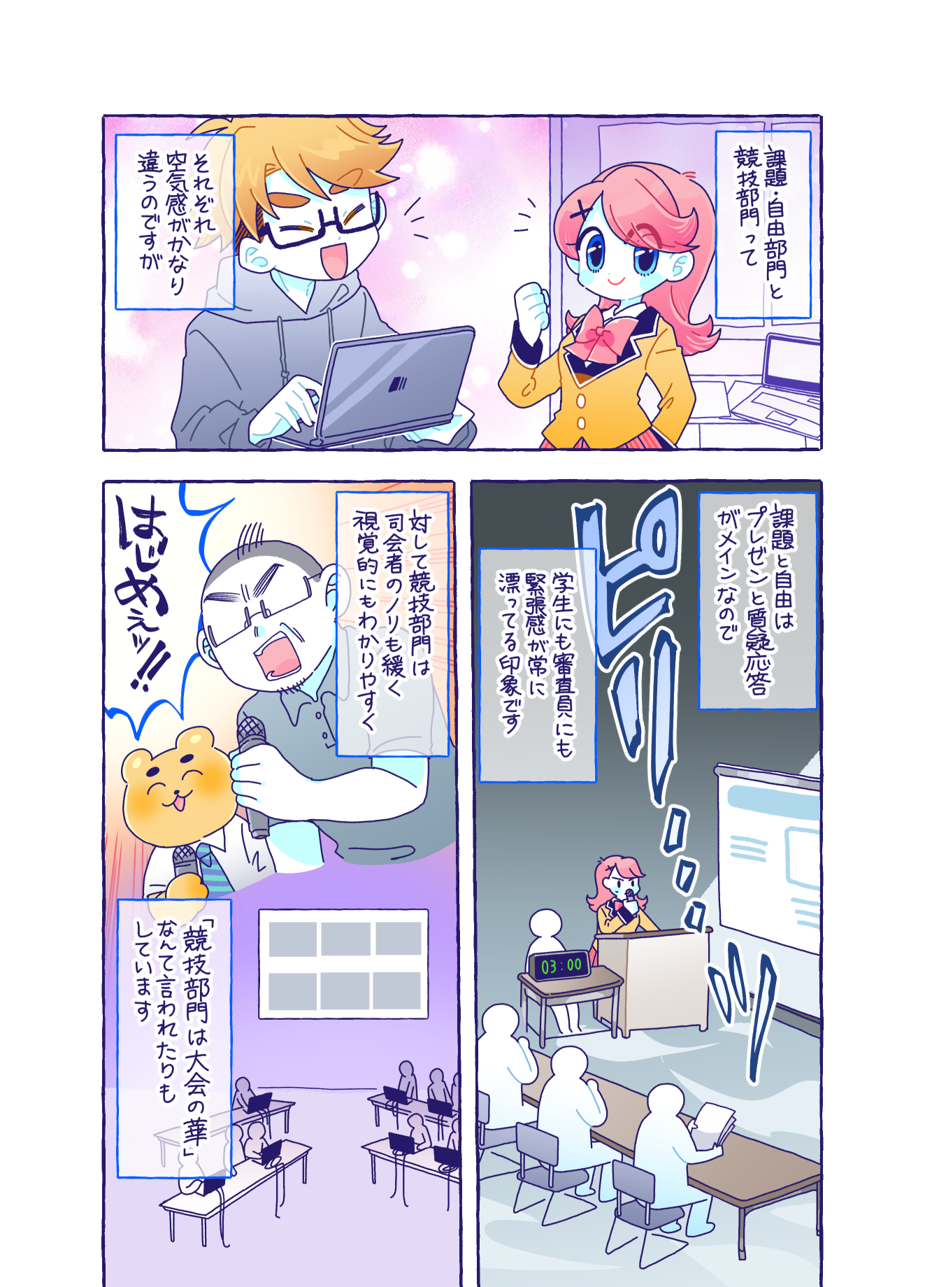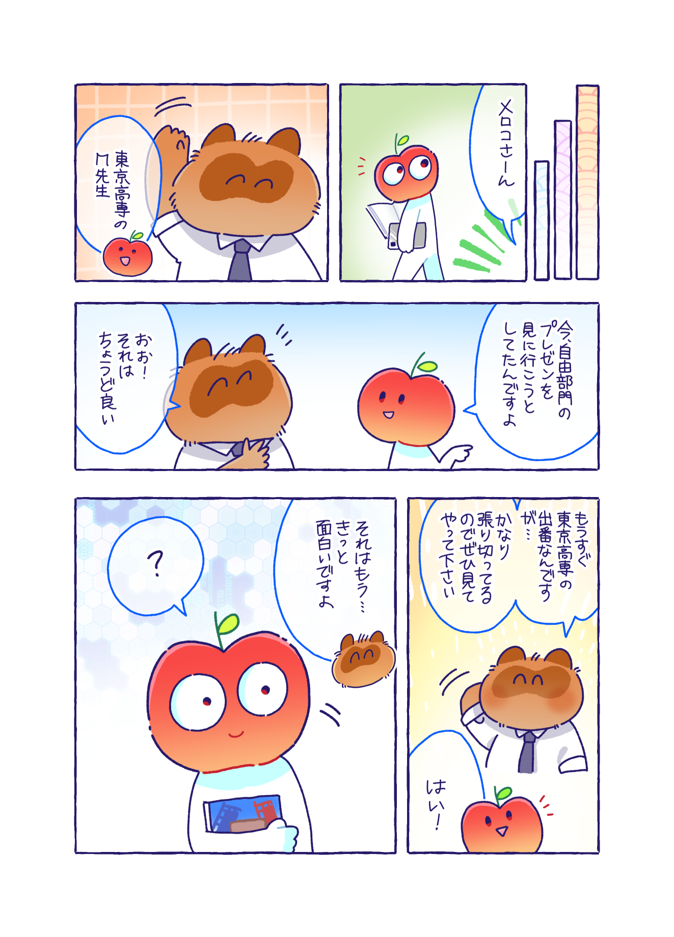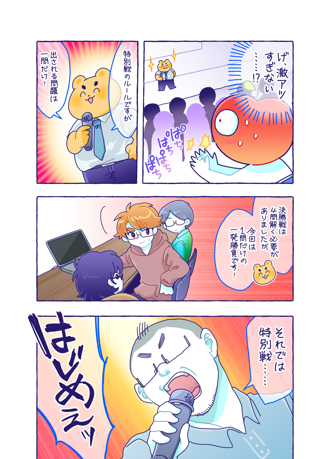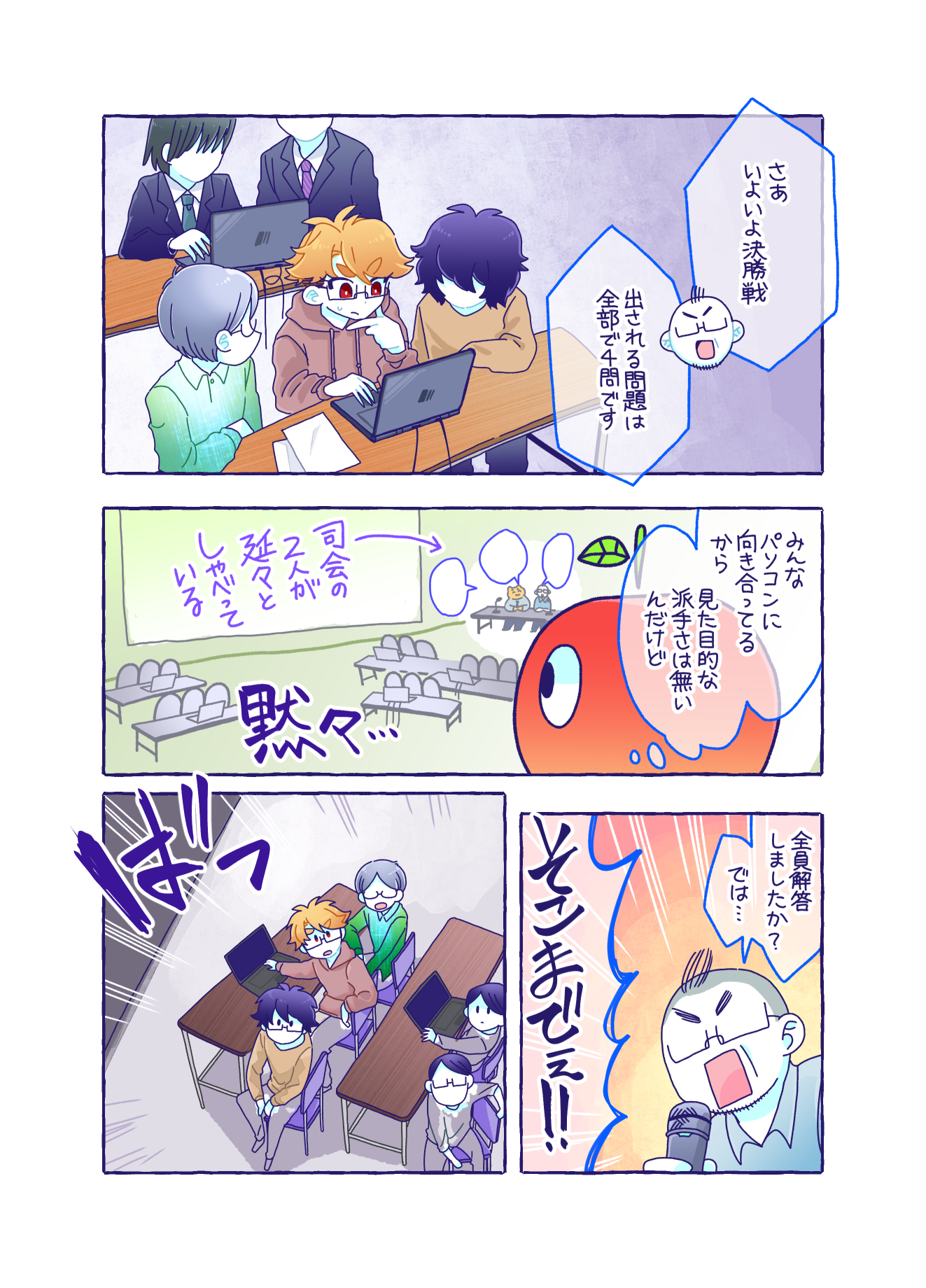 プロコン漫画 トップページ> プロコン漫画 > プロコンレポート2022 第33回群馬大会② プロコンレポート2022 第33回群馬大会② メッセージ どうも。メロコです。 執筆が遅くなり、2022年のレポート漫画になりますが、当時を思い出しながら楽しんでいただけると嬉しいです。 実際にこの試合を見ながらとてもワクワクしたのを2年経っても覚えております。 私はTwitter(現X)をチェックしつつリアルタイムでの感想を感じながら試合を観るのがとても好きです。その感覚が伝わればと思っております。 2年越しのメッセージですが、大阪公大高専さんおめでとうございました。