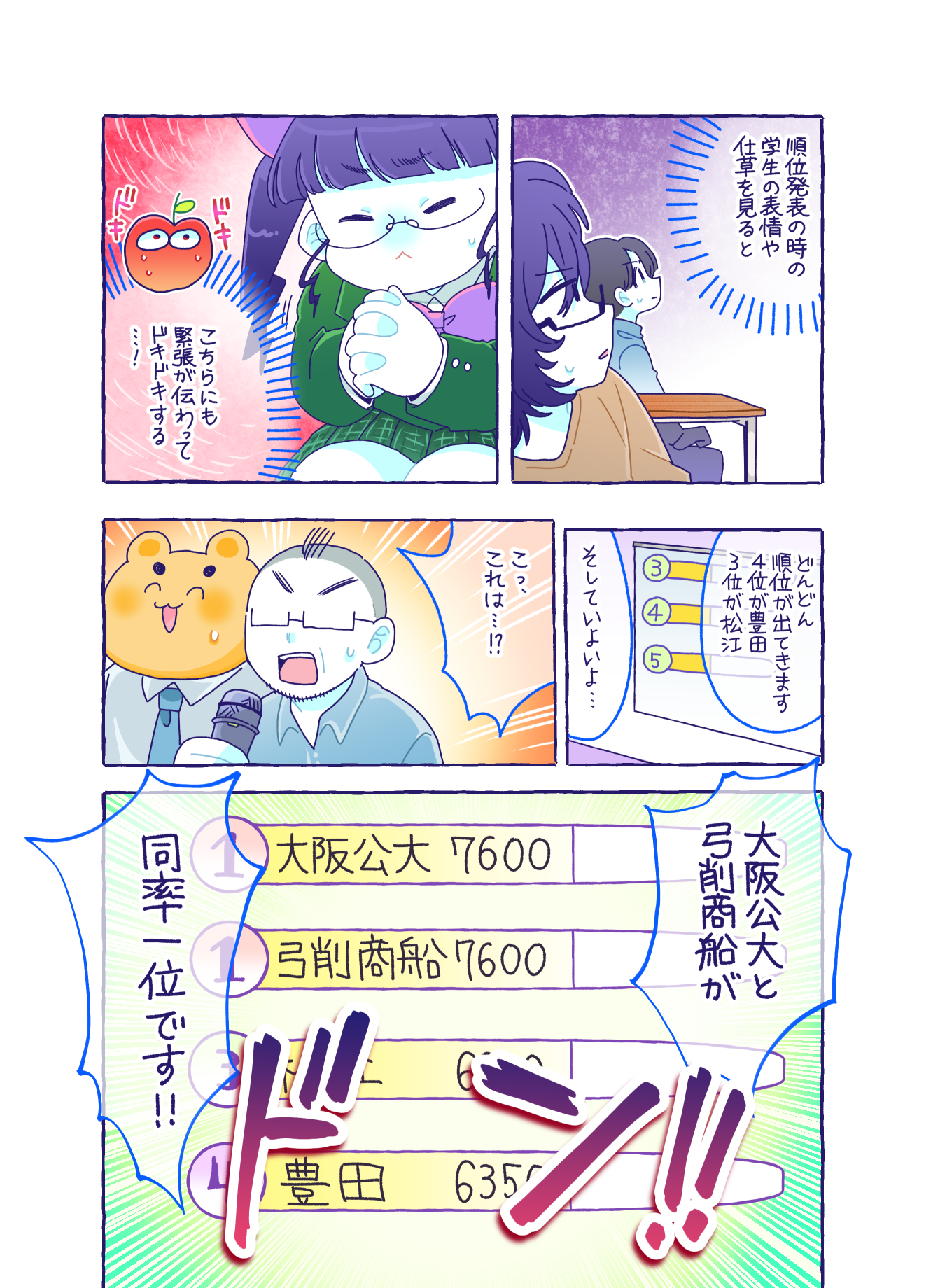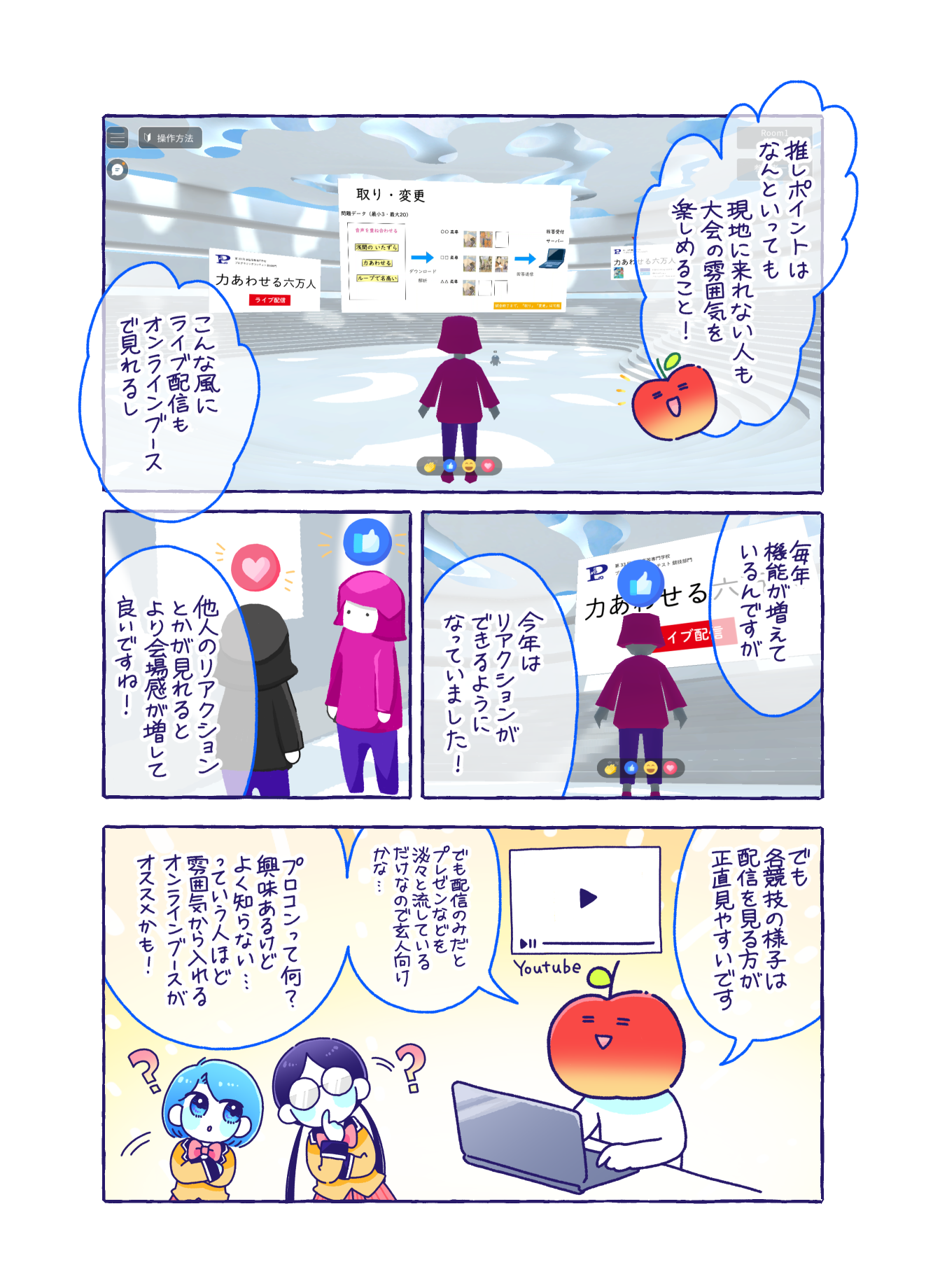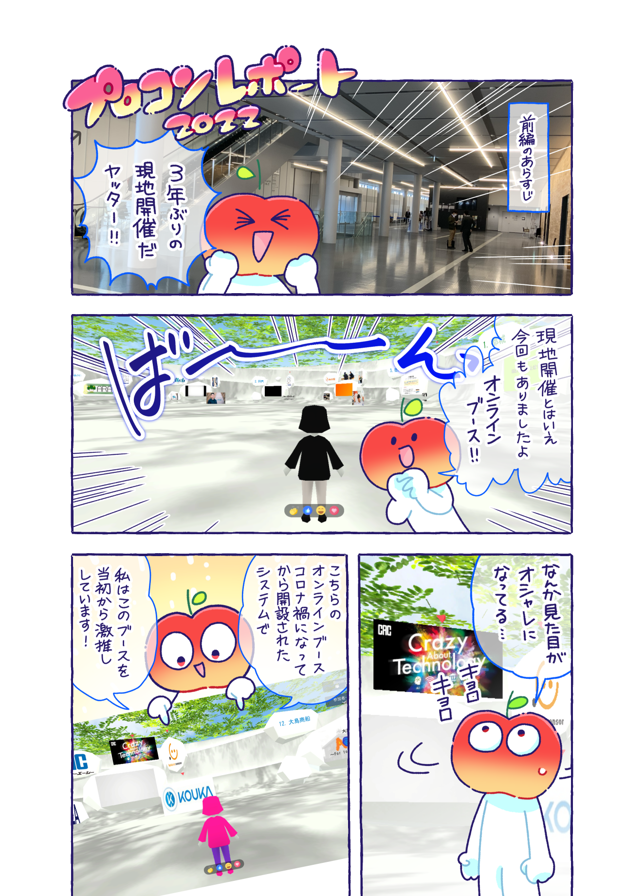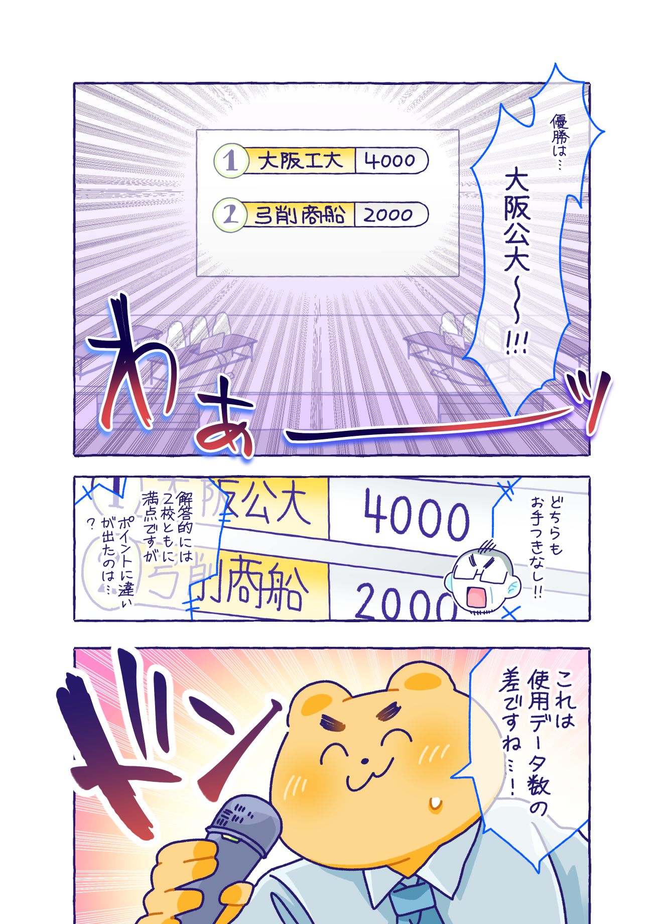プロコン漫画 トップページ> プロコン漫画 > プロコンレポート2022 第33回群馬大会② プロコンレポート2022 第33回群馬大会② メッセージ どうも。メロコです。 執筆が遅くなり、2022年のレポート漫画になりますが、当時を思い出しながら楽しんでいただけると嬉しいです。 実際にこの試合を見ながらとてもワクワクしたのを2年経っても覚えております。 私はTwitter(現X)をチェックしつつリアルタイムでの感想を感じながら試合を観るのがとても好きです。その感覚が伝わればと思っております。 2年越しのメッセージですが、大阪公大高専さんおめでとうございました。