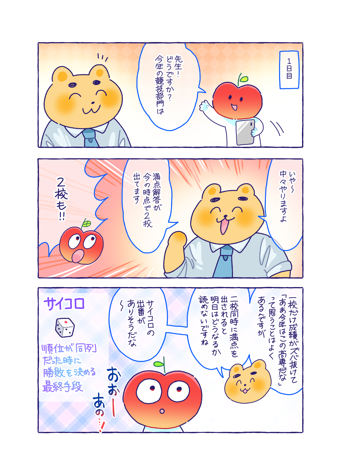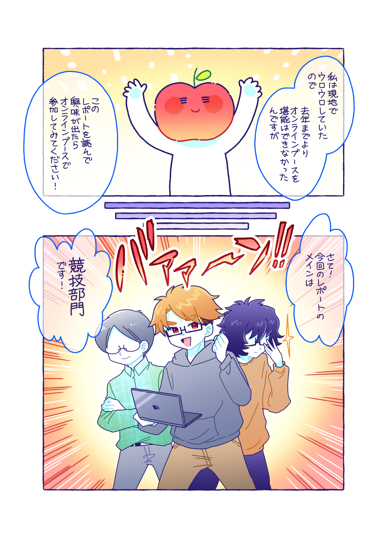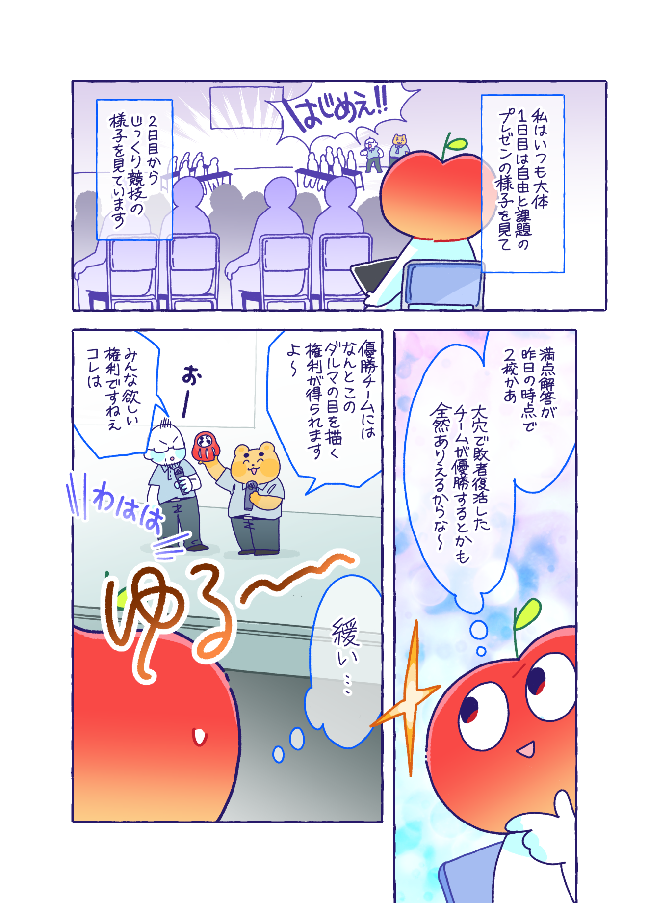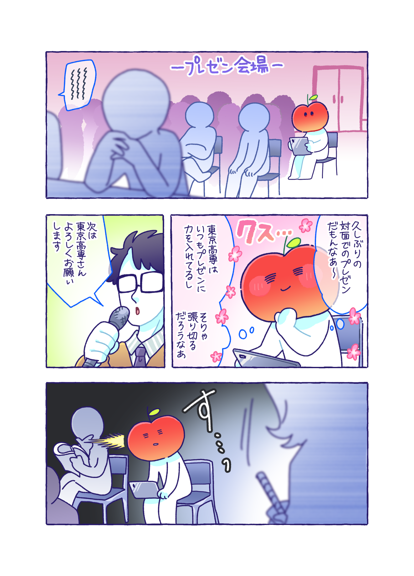 プロコン漫画 トップページ> プロコン漫画 > プロコンレポート2022 第33回群馬大会② プロコンレポート2022 第33回群馬大会② メッセージ どうも。メロコです。 執筆が遅くなり、2022年のレポート漫画になりますが、当時を思い出しながら楽しんでいただけると嬉しいです。 実際にこの試合を見ながらとてもワクワクしたのを2年経っても覚えております。 私はTwitter(現X)をチェックしつつリアルタイムでの感想を感じながら試合を観るのがとても好きです。その感覚が伝わればと思っております。 2年越しのメッセージですが、大阪公大高専さんおめでとうございました。