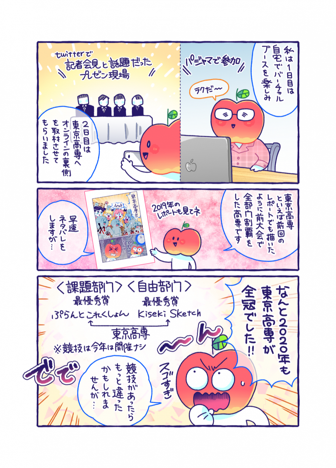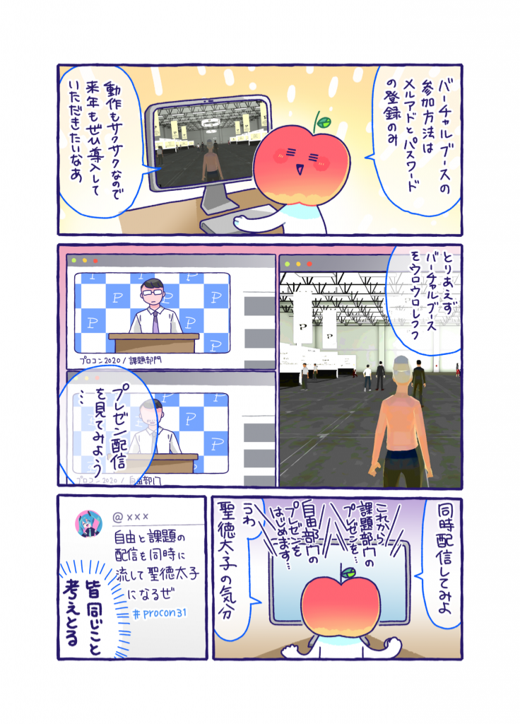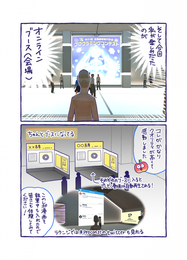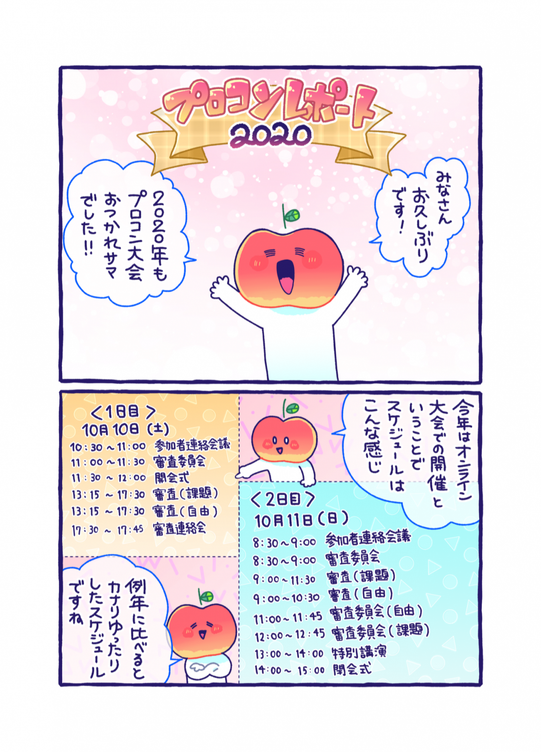 プロコン漫画 トップページ> プロコン漫画 > プロコンレポート2020 第31回苫小牧大会① プロコンレポート2020 第31回苫小牧大会① メッセージ お待たせしました。プロコン2020のレポートです。 はじめてのオンライン開催ということでどんな感じになるんだろうと思っていましたがいつもと違う雰囲気が新鮮でいつもと変わらずとても楽しかったです。 作中、オンラインブースに行ってみて欲しいと描いてありますが流石に6月現在は入れなくなっているようでした。 今年もオンライン開催となりましたね。今年は競技も開催できるとのことなので更に楽しみです。