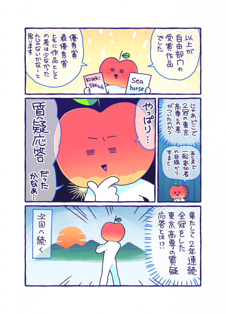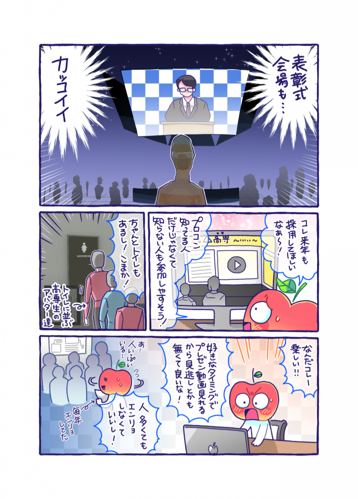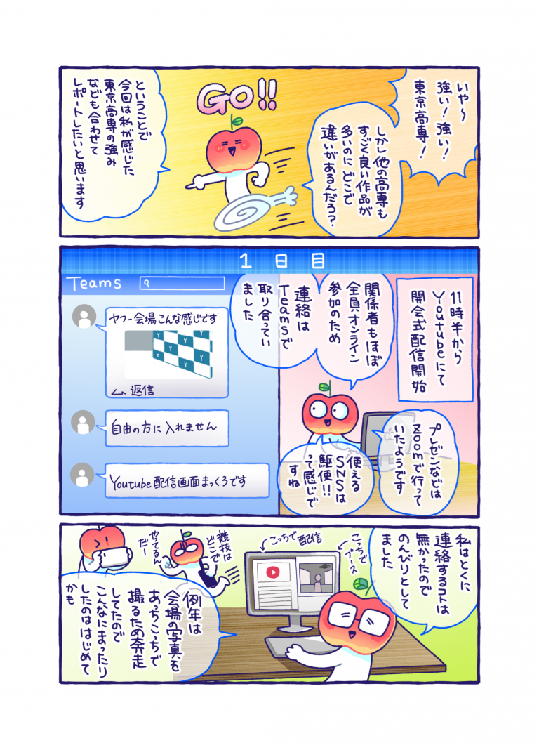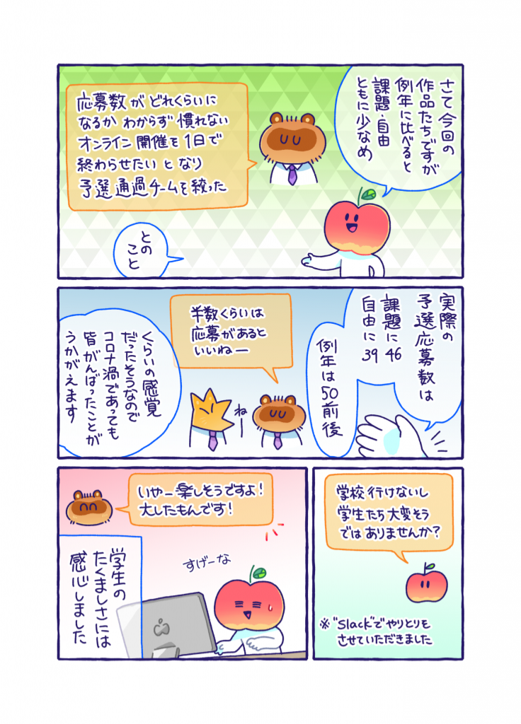 プロコン漫画 トップページ> プロコン漫画 > プロコンレポート2020 第31回苫小牧大会① プロコンレポート2020 第31回苫小牧大会① メッセージ お待たせしました。プロコン2020のレポートです。 はじめてのオンライン開催ということでどんな感じになるんだろうと思っていましたがいつもと違う雰囲気が新鮮でいつもと変わらずとても楽しかったです。 作中、オンラインブースに行ってみて欲しいと描いてありますが流石に6月現在は入れなくなっているようでした。 今年もオンライン開催となりましたね。今年は競技も開催できるとのことなので更に楽しみです。