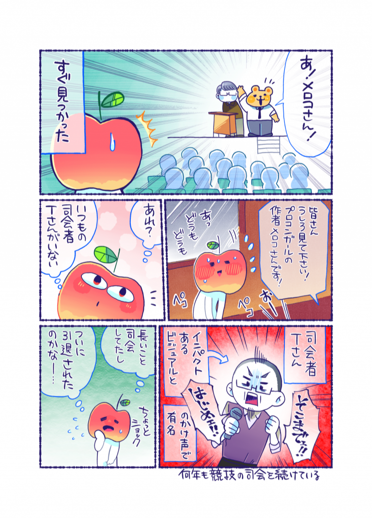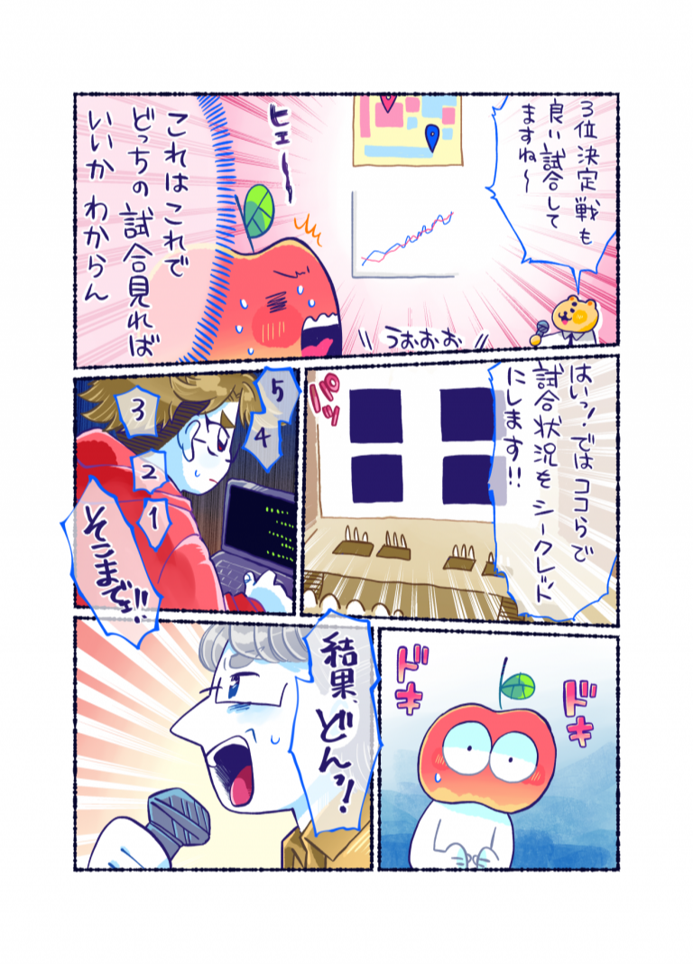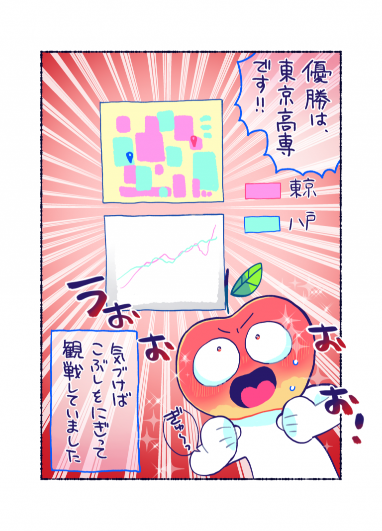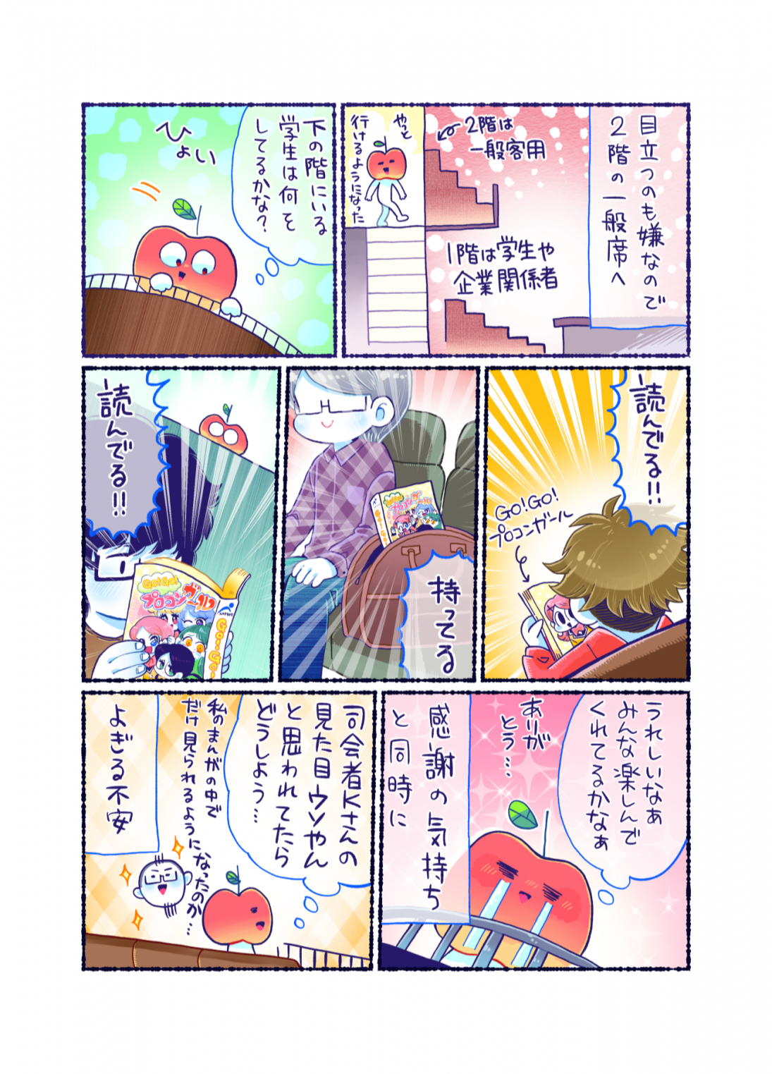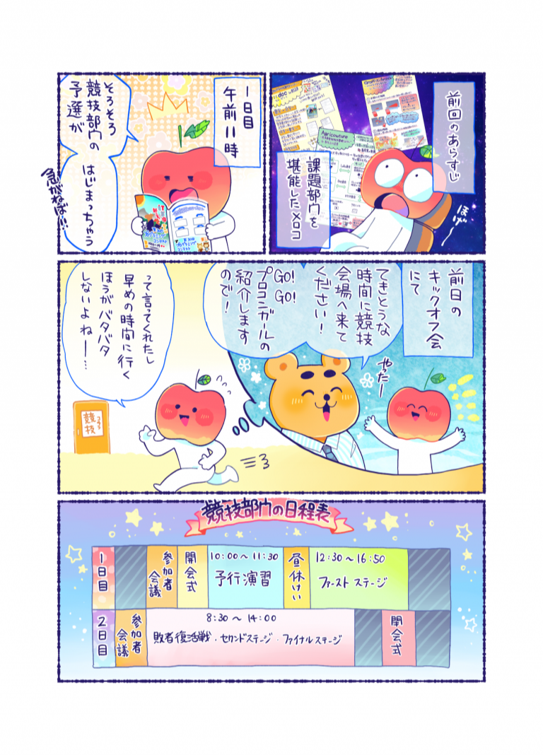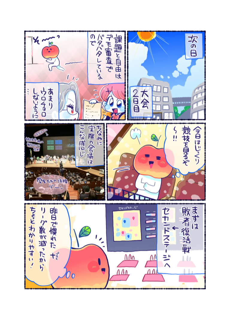 プロコン漫画 トップページ> プロコン漫画 > 大会レポート 第30回都城大会その2(中編) 大会レポート 第30回都城大会その2(中編) メッセージ プロコンレポート中編です。競技部門のセカンドステージやファイナルステージ、本当に観てて心臓がドキドキしました。すごく楽しかったです。さすが競技はプロコンの華と呼ばれているだけあるなと思いました。司会者Tさんいつまでもその掛け声を聞かせてくださいね。