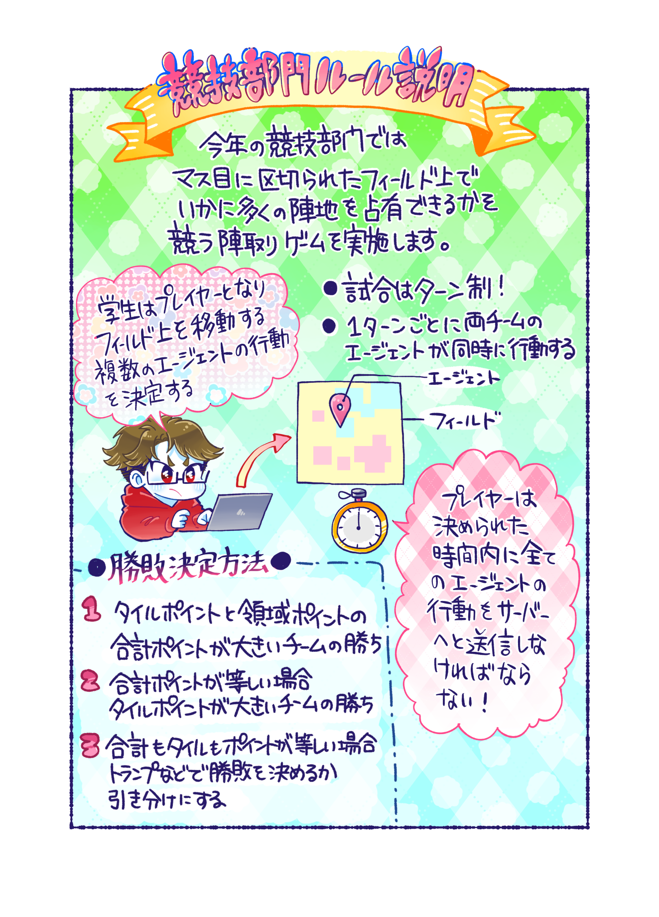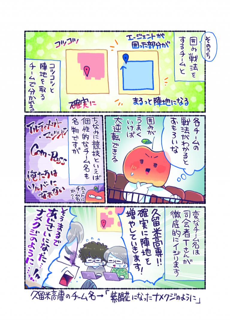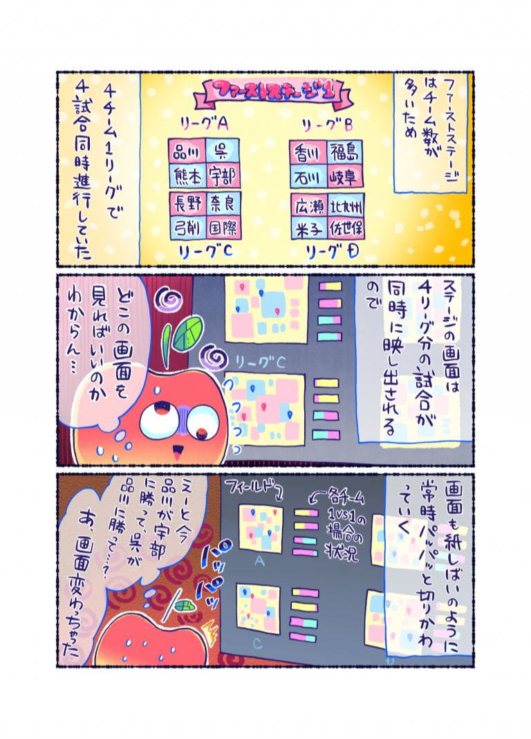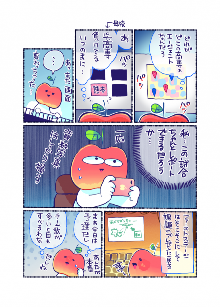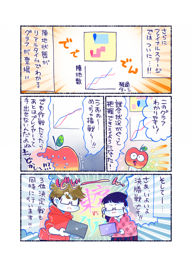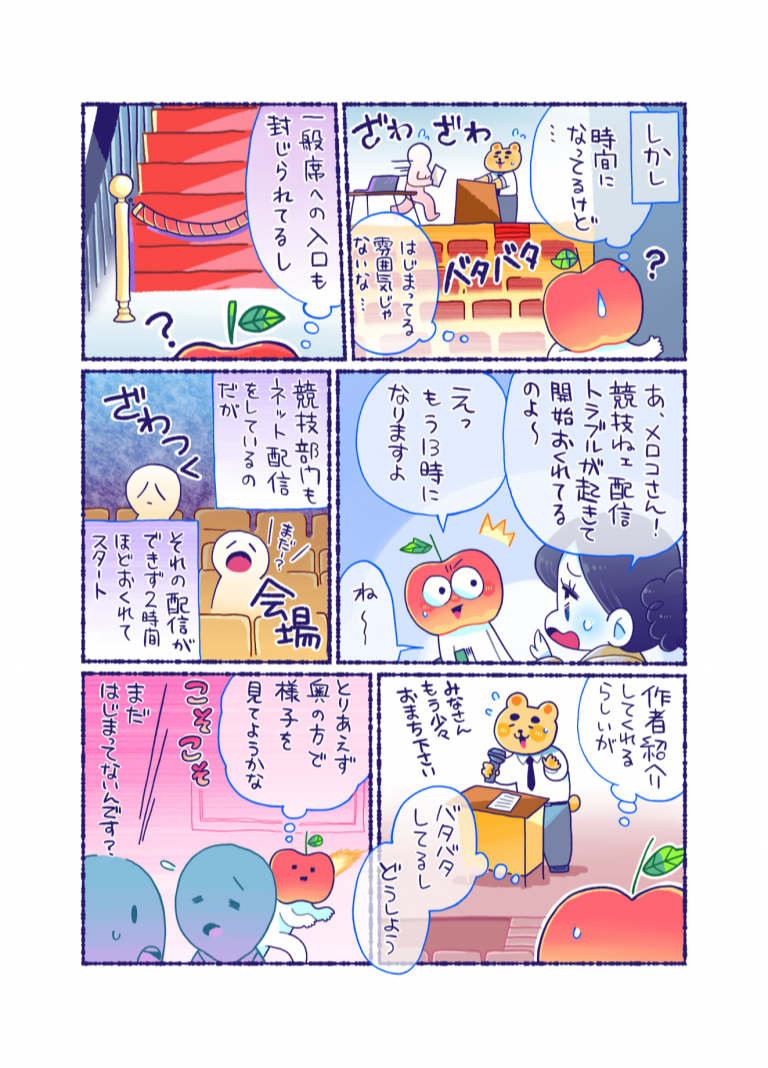 プロコン漫画 トップページ> プロコン漫画 > 大会レポート 第30回都城大会その2(中編) 大会レポート 第30回都城大会その2(中編) メッセージ プロコンレポート中編です。競技部門のセカンドステージやファイナルステージ、本当に観てて心臓がドキドキしました。すごく楽しかったです。さすが競技はプロコンの華と呼ばれているだけあるなと思いました。司会者Tさんいつまでもその掛け声を聞かせてくださいね。