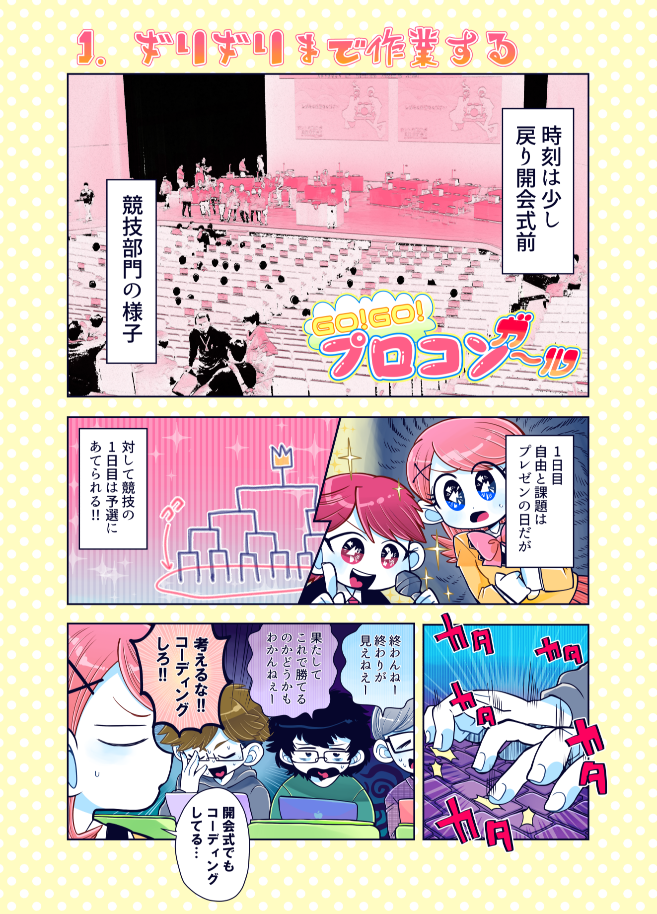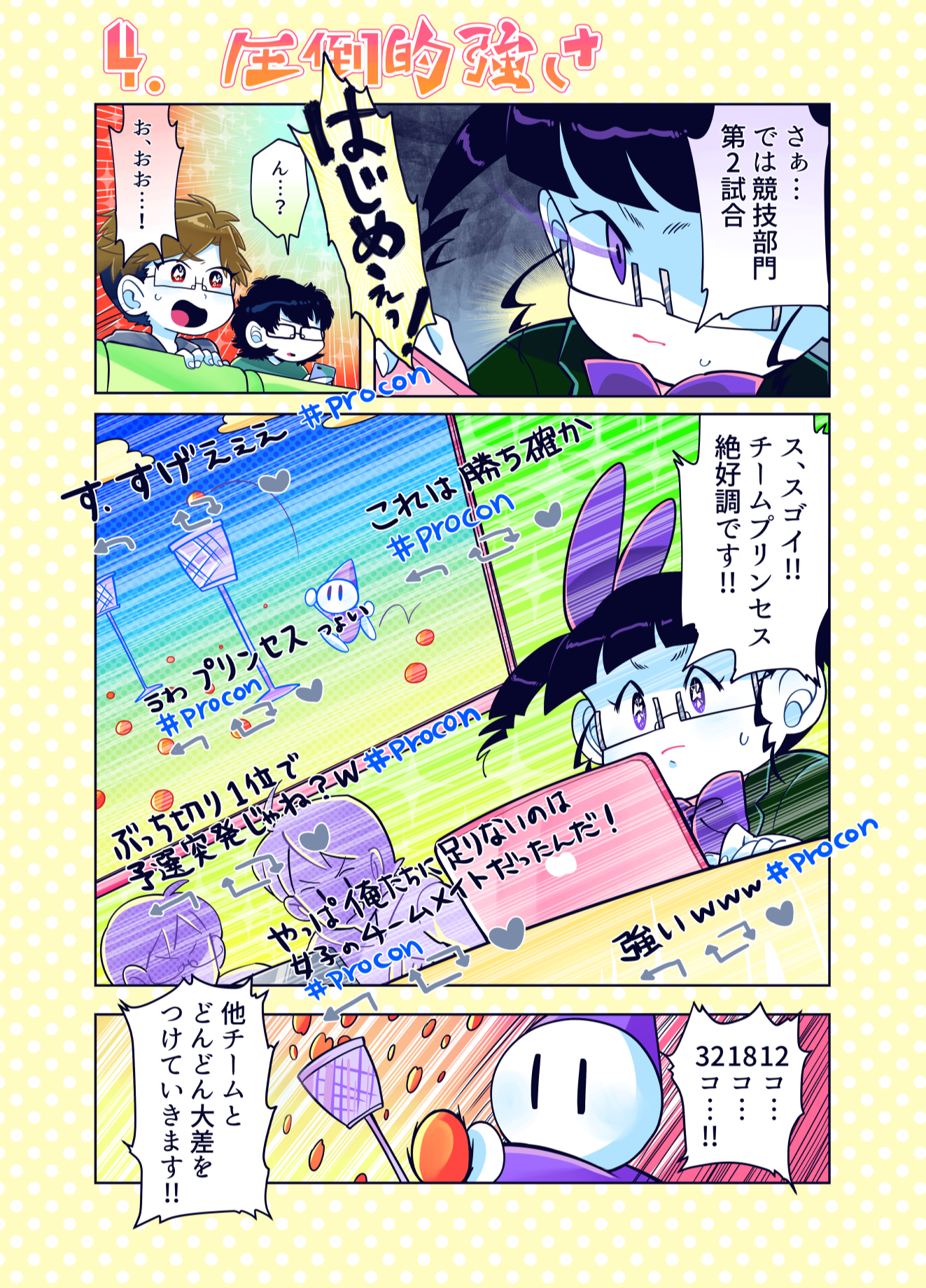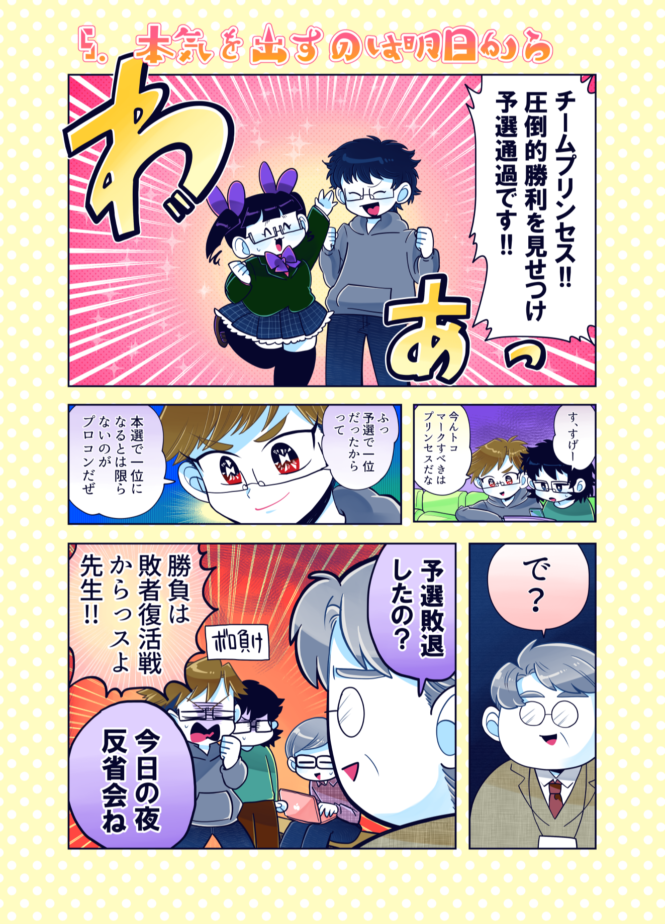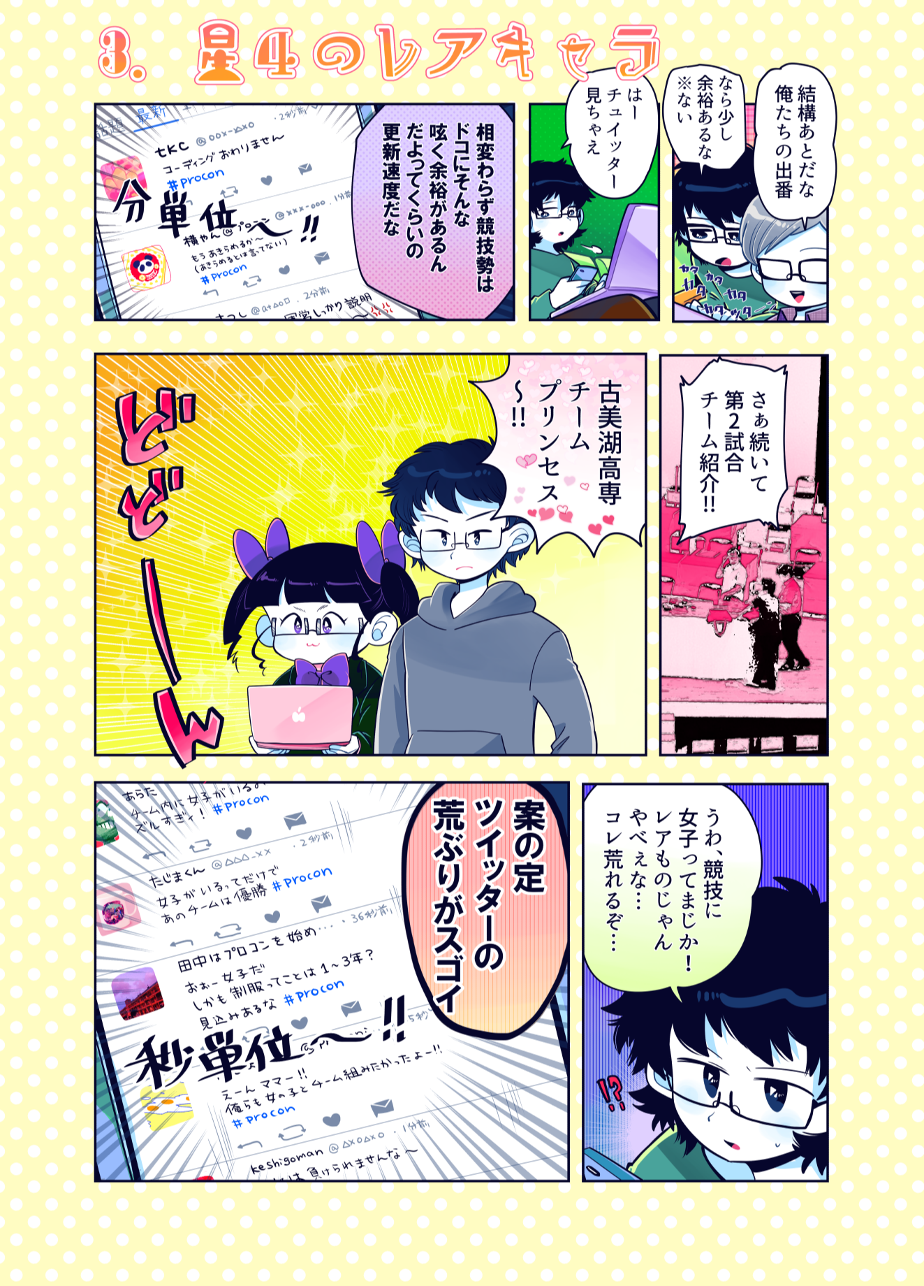 プロコン漫画 トップページ> プロコン漫画 > 第7話 プロコン大会午後の部! 第7話 プロコン大会午後の部! メッセージ 「それゆけ女子高専生での姫ちゃんとの対決です。 姫ちゃんがどうなるかは…それゆけ女子高専生を見てくださっている方は知って いると思いますが、チームやきにくはどうなるのか!?次回に続く! あやこはプロコンはやりたかったけどパパと一緒はどうしても嫌だったようです。」