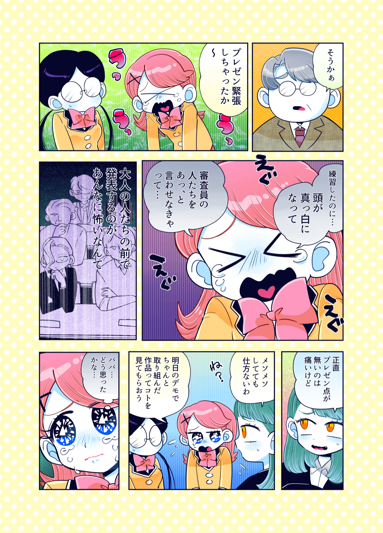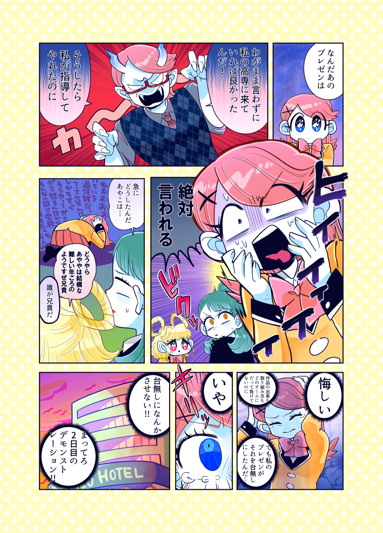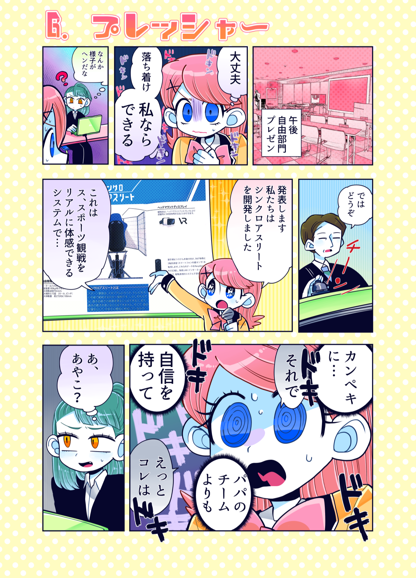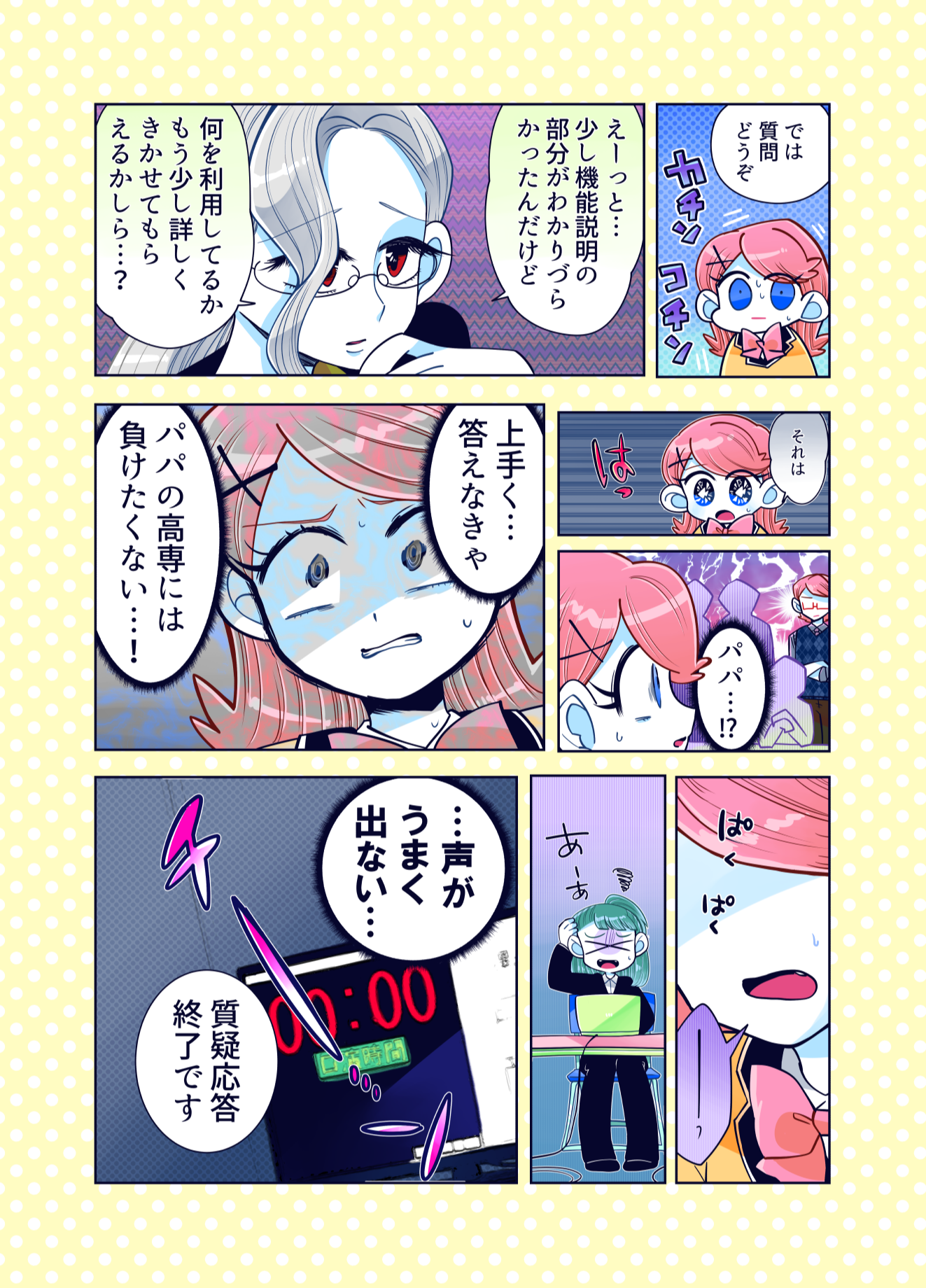 プロコン漫画 トップページ> プロコン漫画 > 第7話 プロコン大会午後の部! 第7話 プロコン大会午後の部! メッセージ 「それゆけ女子高専生での姫ちゃんとの対決です。 姫ちゃんがどうなるかは…それゆけ女子高専生を見てくださっている方は知って いると思いますが、チームやきにくはどうなるのか!?次回に続く! あやこはプロコンはやりたかったけどパパと一緒はどうしても嫌だったようです。」