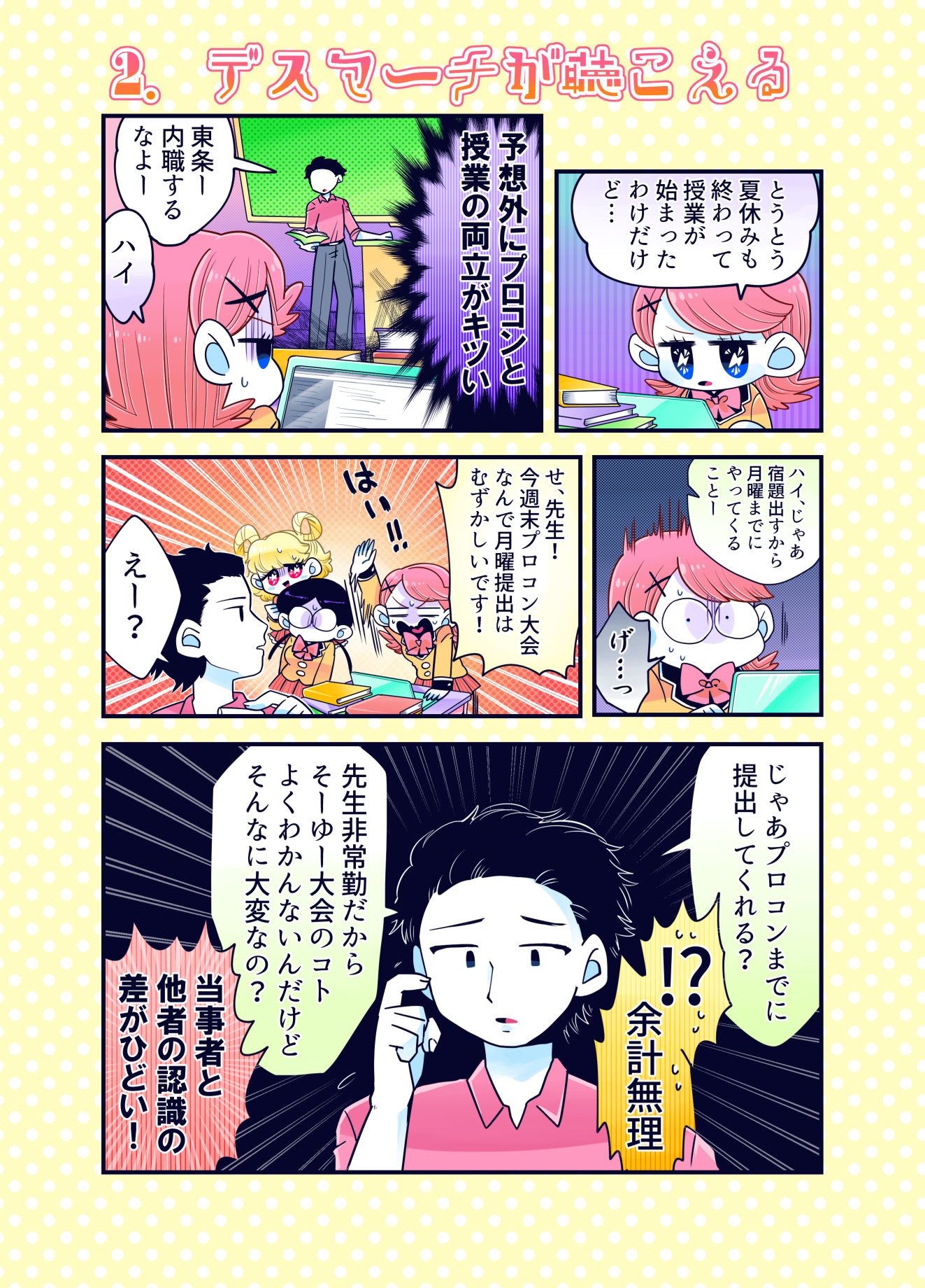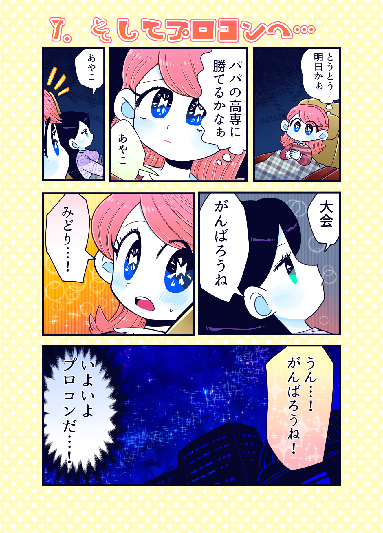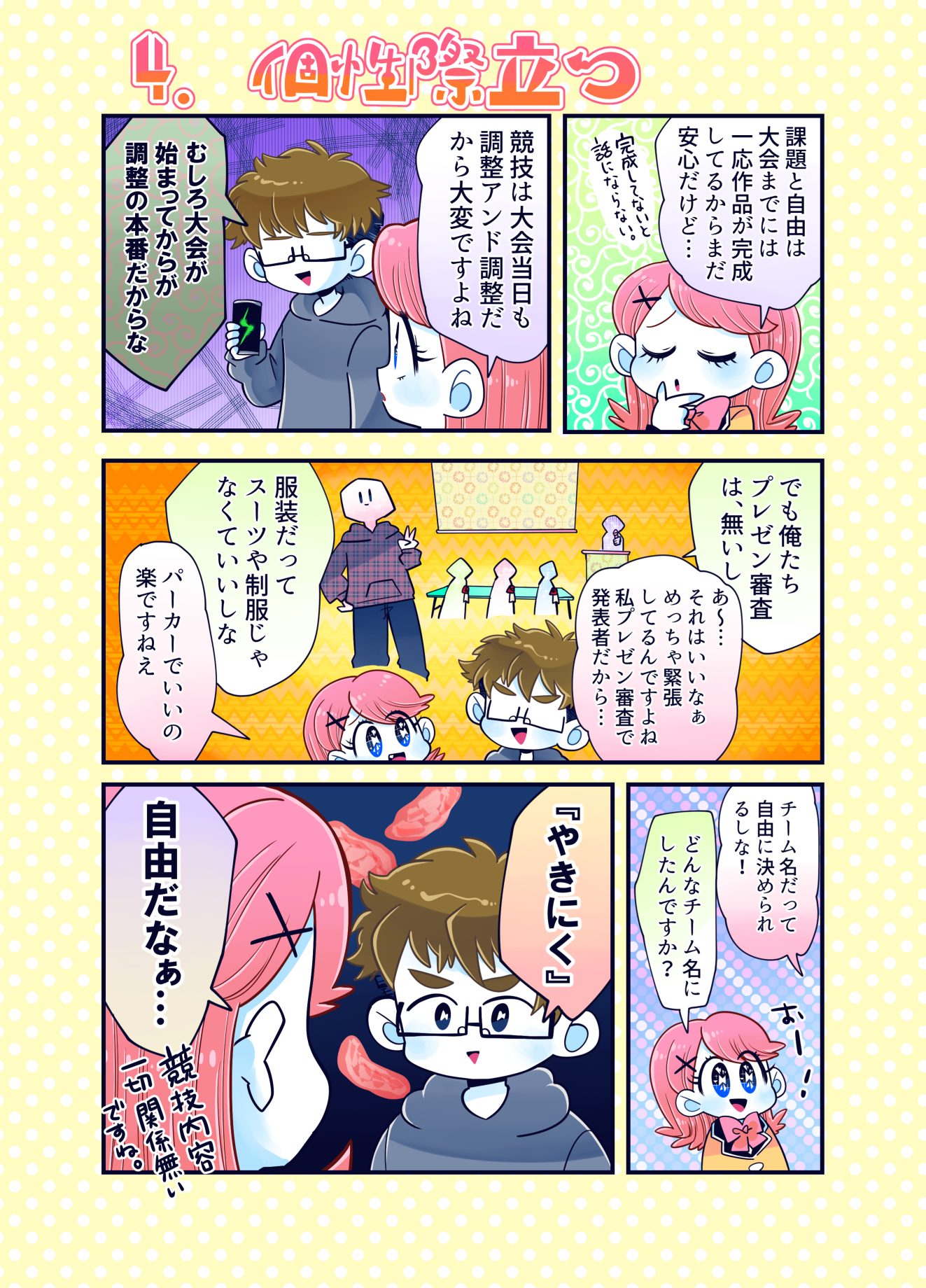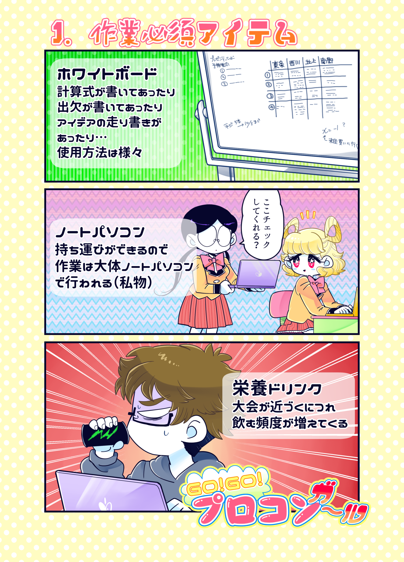 プロコン漫画 トップページ> プロコン漫画 > 第5話 大会までのデスマーチ 第5話 大会までのデスマーチ メッセージ みなさん先日はプロコン本大会お疲れさまでした! 林檎子もひっそりと観に行っていました。 プロコンを実際に見るのは初めてだったので新鮮でとても面白かったです。 漫画に生かせそうな面白いこともたくさんありました。 2016年のプロコン大会は終わりましたが、漫画ではしばらく本大会の話が続きますので、よろしくお願いします。