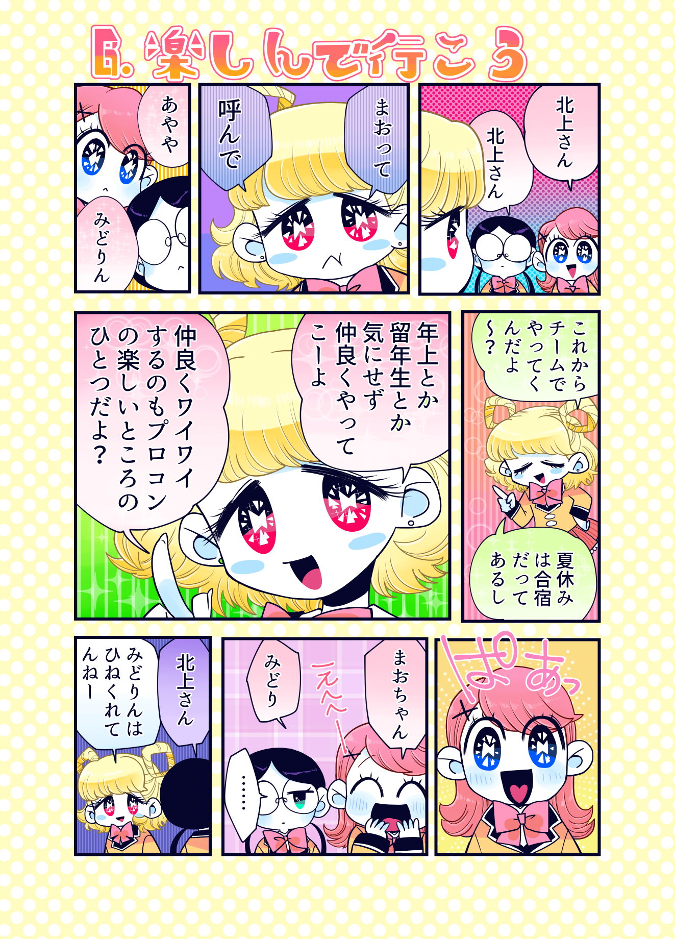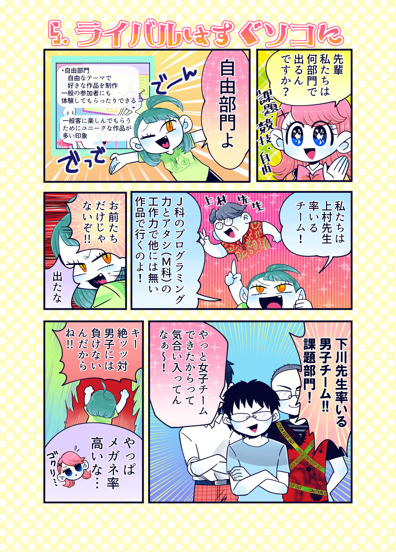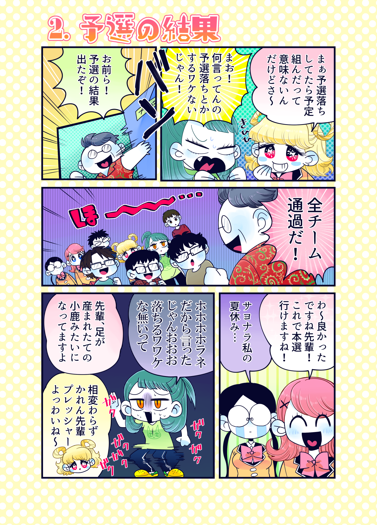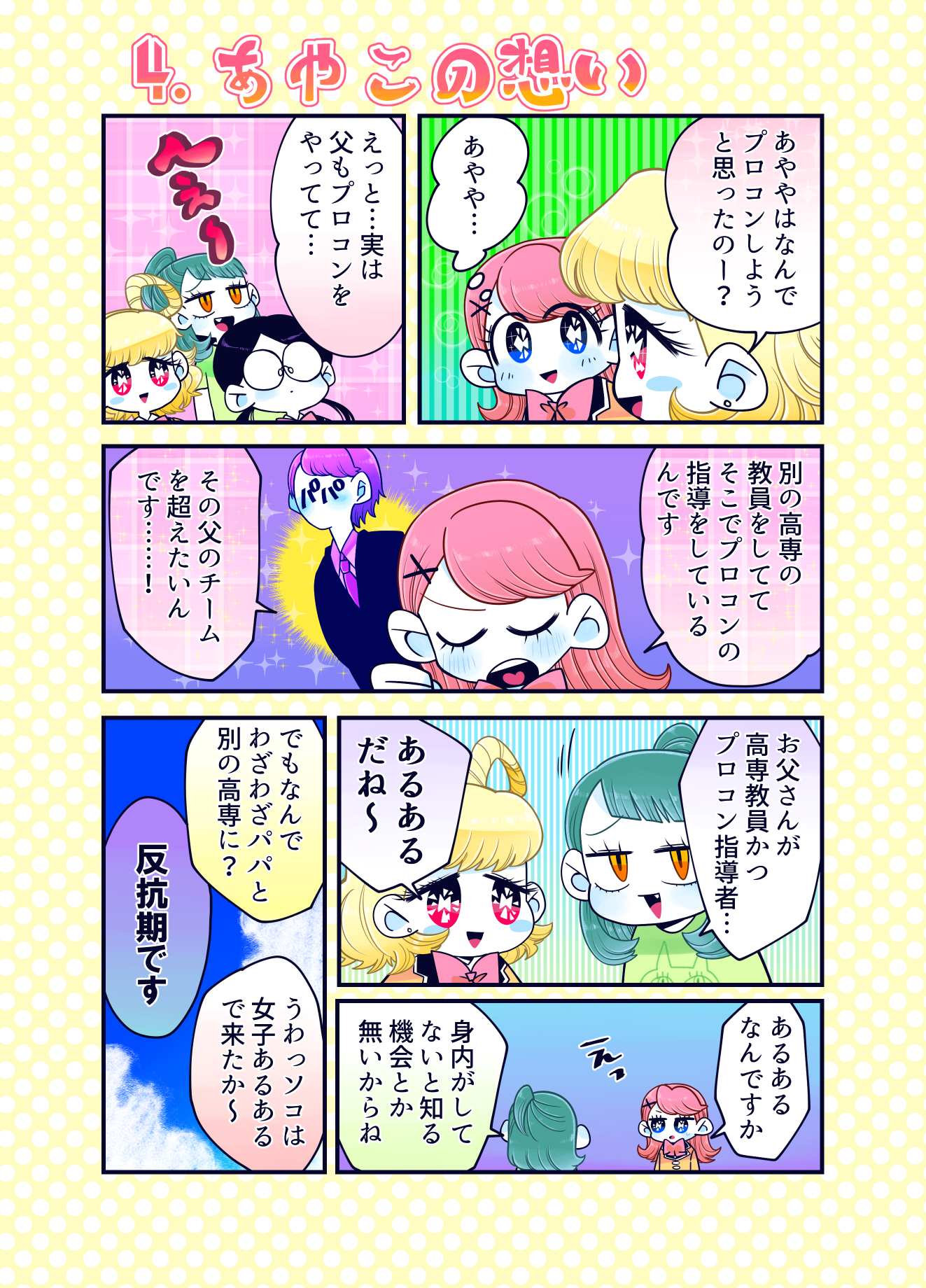 プロコン漫画 トップページ> プロコン漫画 > 第2話 ついに予選発表!? 第2話 ついに予選発表!? メッセージ 2話です。 今回も色々なキャラが続々出る予感がします。 あやこの「高専教員である父親に対して反抗期だったから父とは別の高専に行った」というのは友人の実話です。 親が高専教員、もしくは高専卒という2世高専生はどこの高専でも珍しくないように思います。 八月に更新される3話はきっと合宿の話です。 どんなドタバタ劇が起こるのかこうご期待!