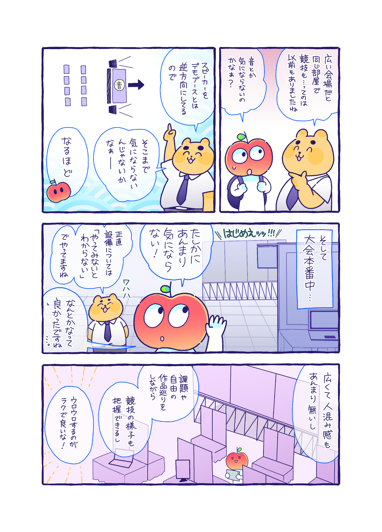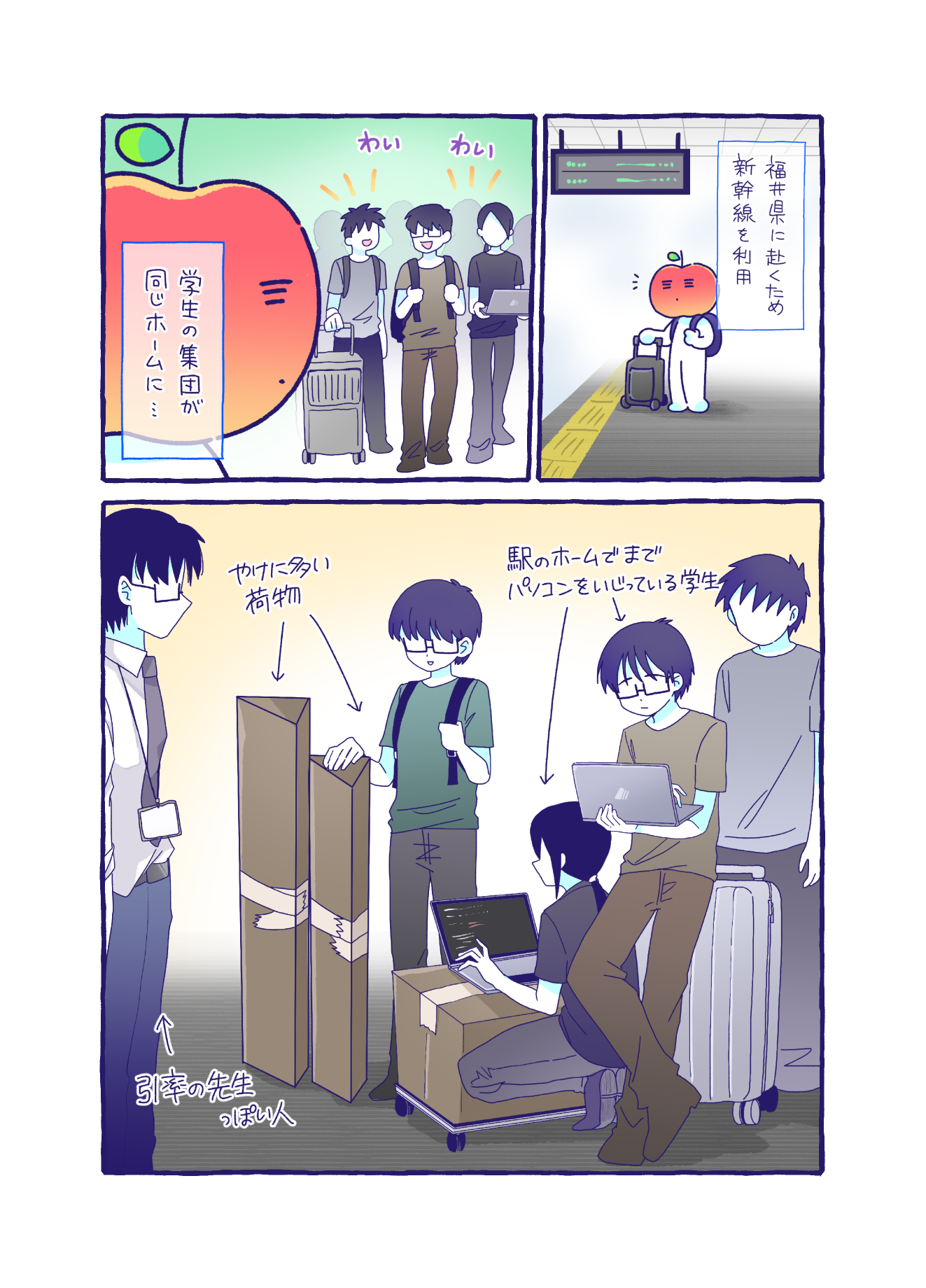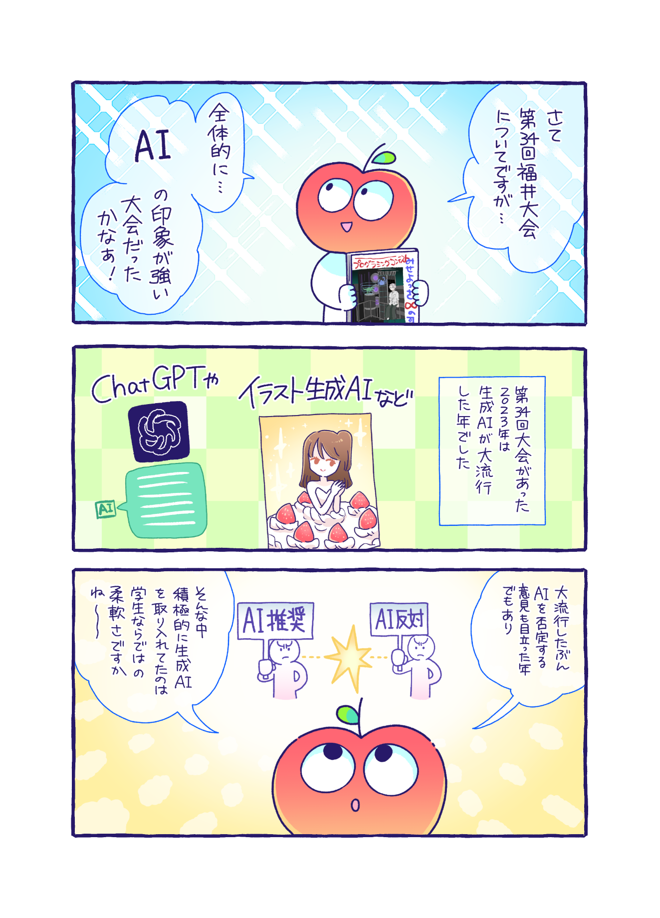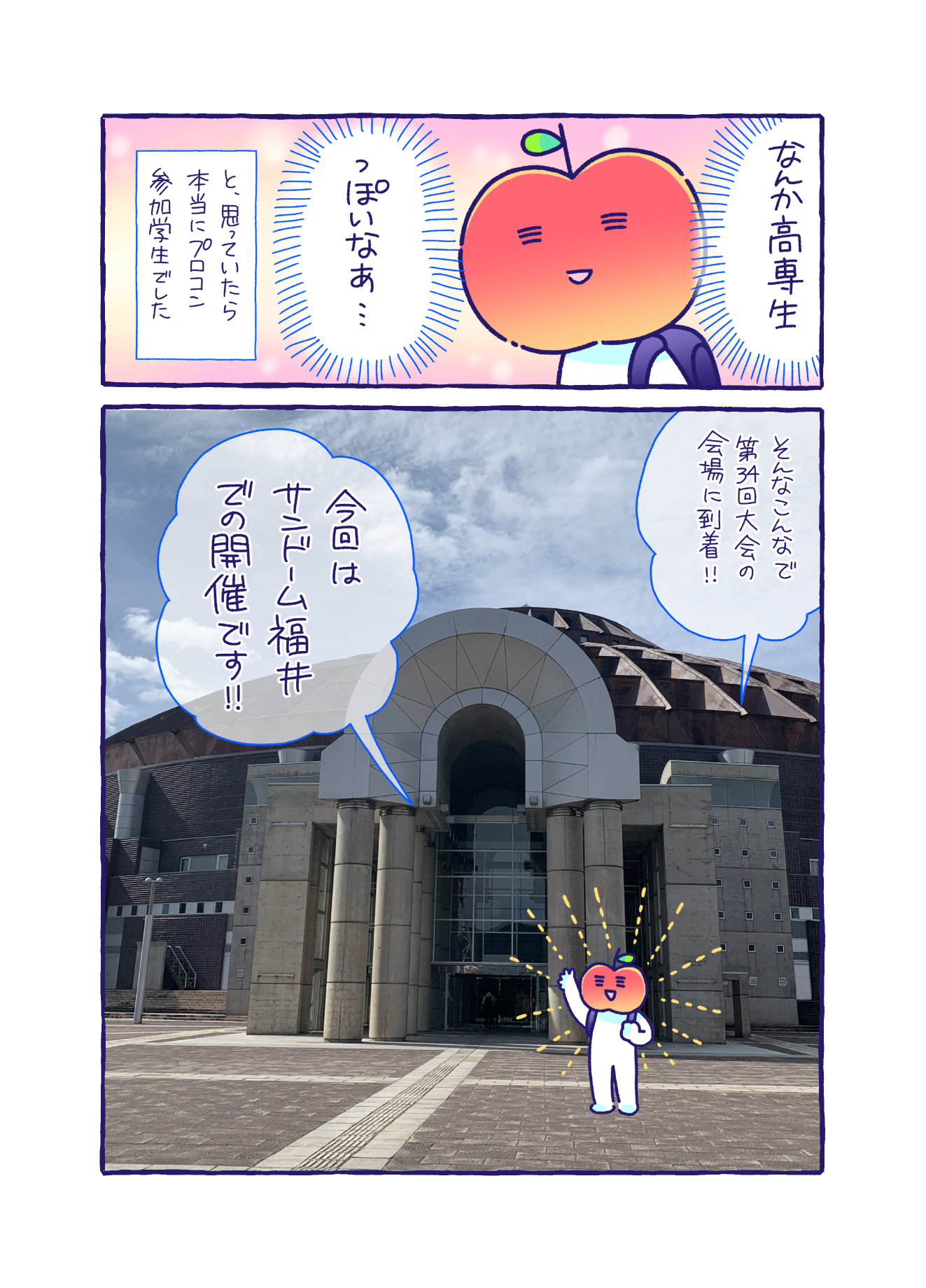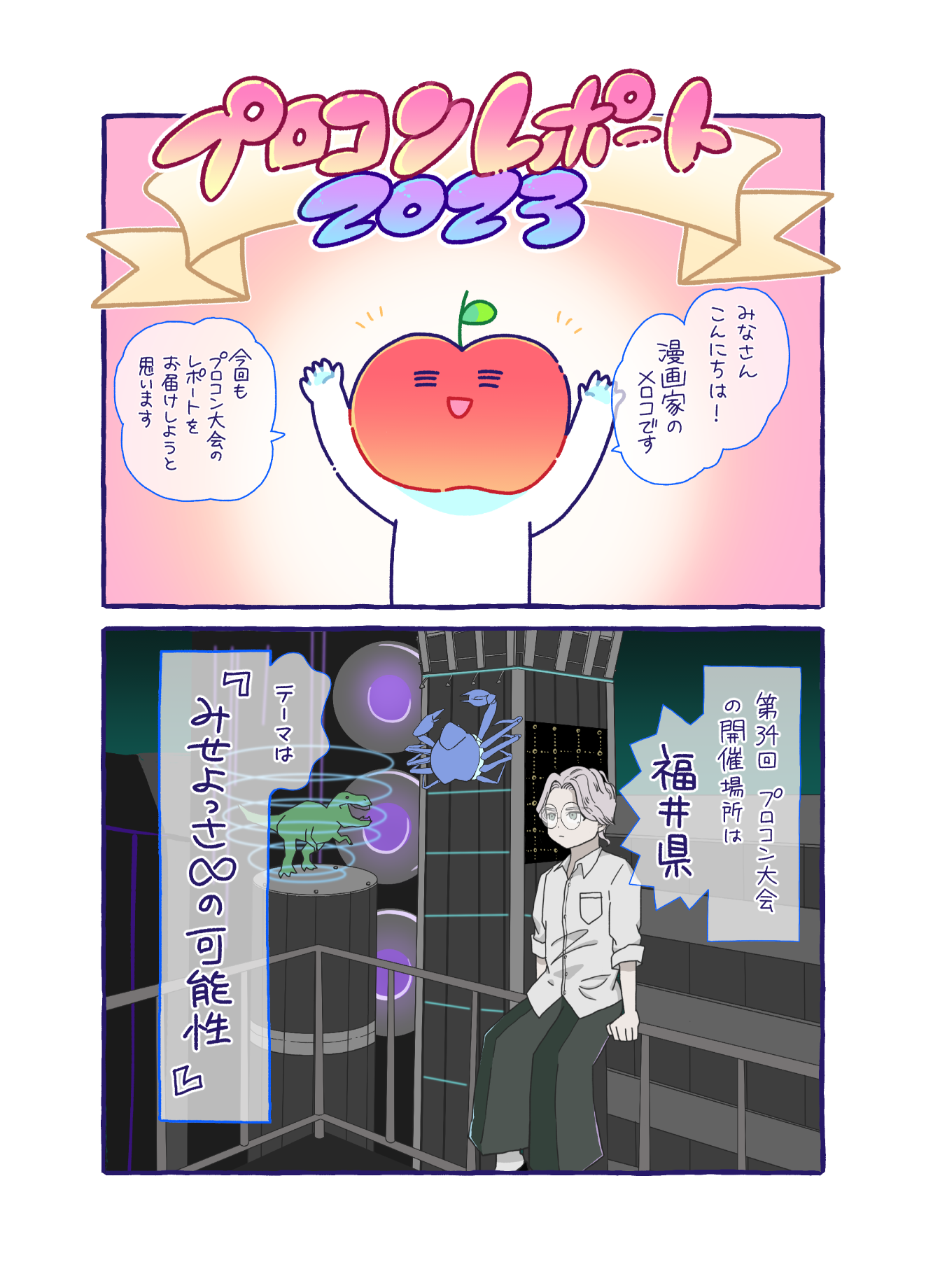 プロコン漫画 トップページ> プロコン漫画 > プロコンレポート2023 第34回福井大会① プロコンレポート2023 第34回福井大会① メッセージ 「おまたせしました。福井大会でのプロコンレポートです。 福井大会は特に作品の特徴が顕著で、AIの使い方が前大会までと大きく変わった年だったことが強く印象に残っております。 そして初めて福井県に私は行ったのですが、プロコン大会後に訪れた眼鏡ミュージアムが大変よい場所だったなということも強く印象に残っております。 1年前の大会のレポートではございますが、「そういえばこんな大会だったナ~」と思い返していただければ幸いです。」