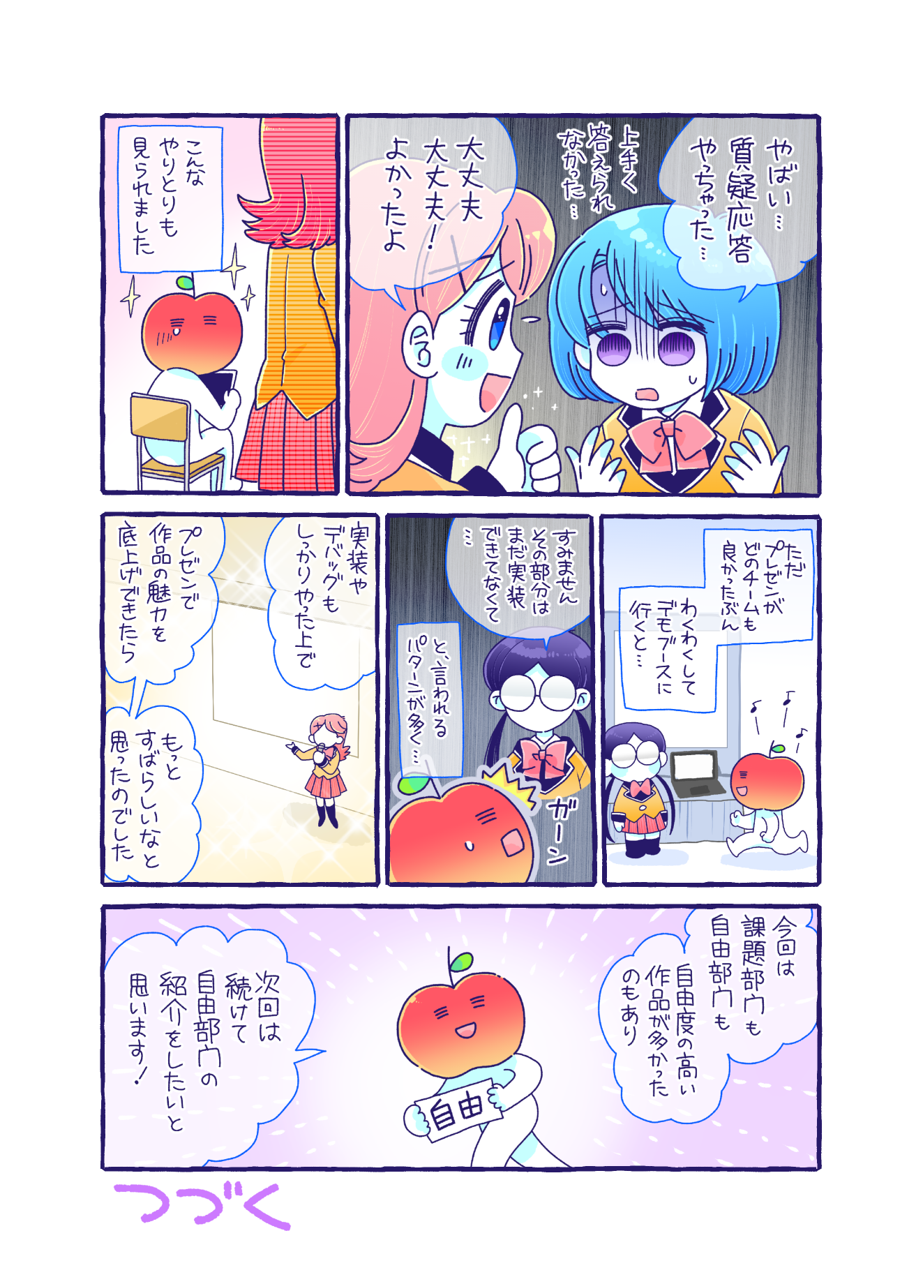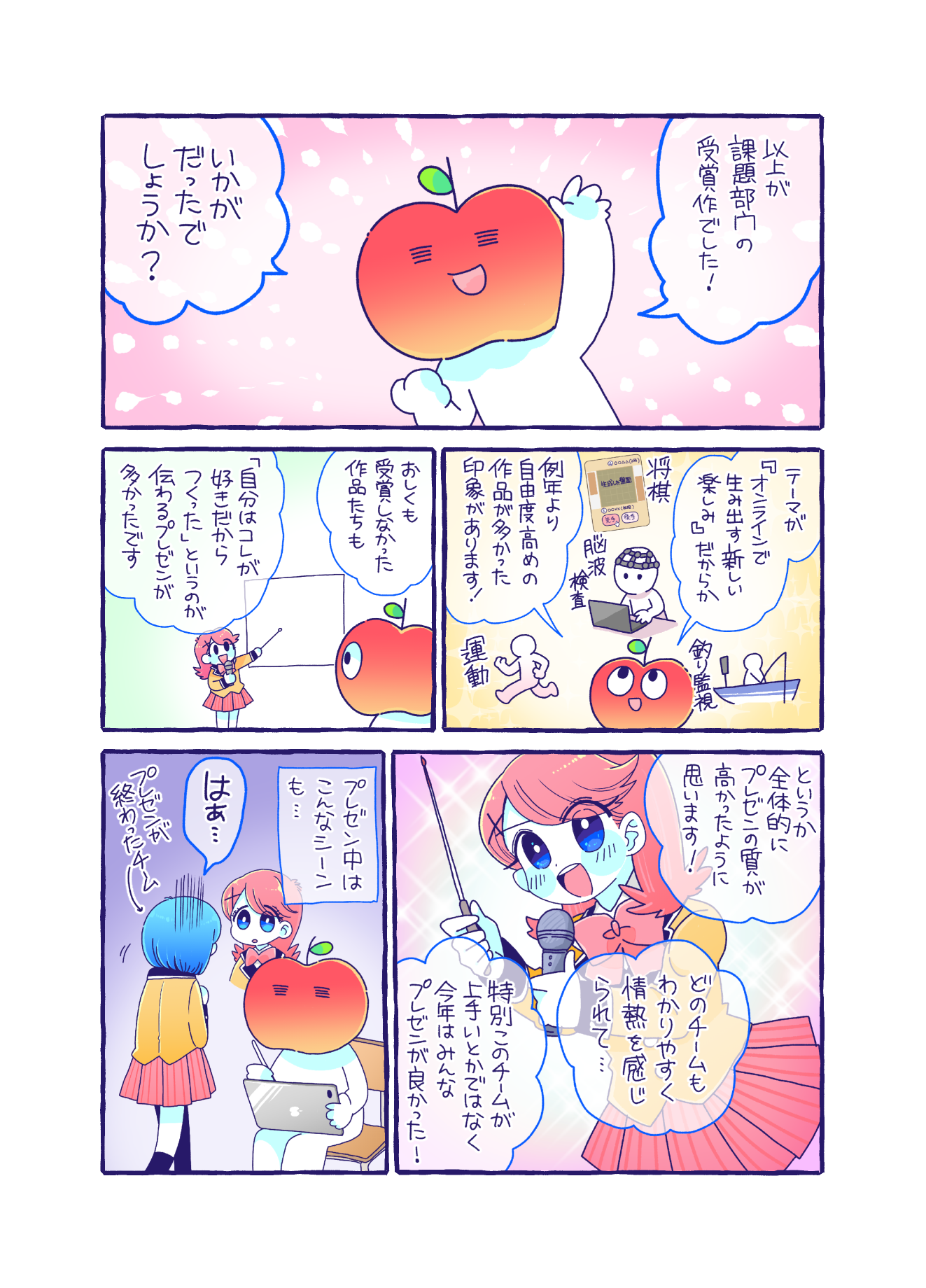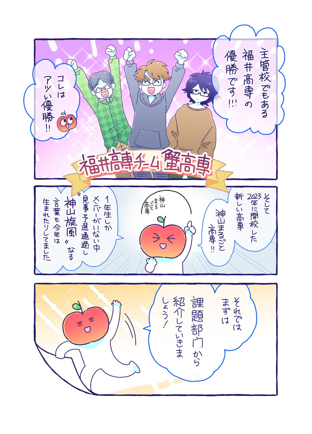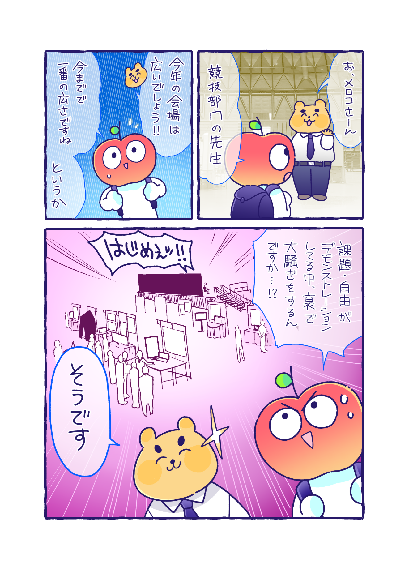 プロコン漫画 トップページ> プロコン漫画 > プロコンレポート2023 第34回福井大会① プロコンレポート2023 第34回福井大会① メッセージ 「おまたせしました。福井大会でのプロコンレポートです。 福井大会は特に作品の特徴が顕著で、AIの使い方が前大会までと大きく変わった年だったことが強く印象に残っております。 そして初めて福井県に私は行ったのですが、プロコン大会後に訪れた眼鏡ミュージアムが大変よい場所だったなということも強く印象に残っております。 1年前の大会のレポートではございますが、「そういえばこんな大会だったナ~」と思い返していただければ幸いです。」