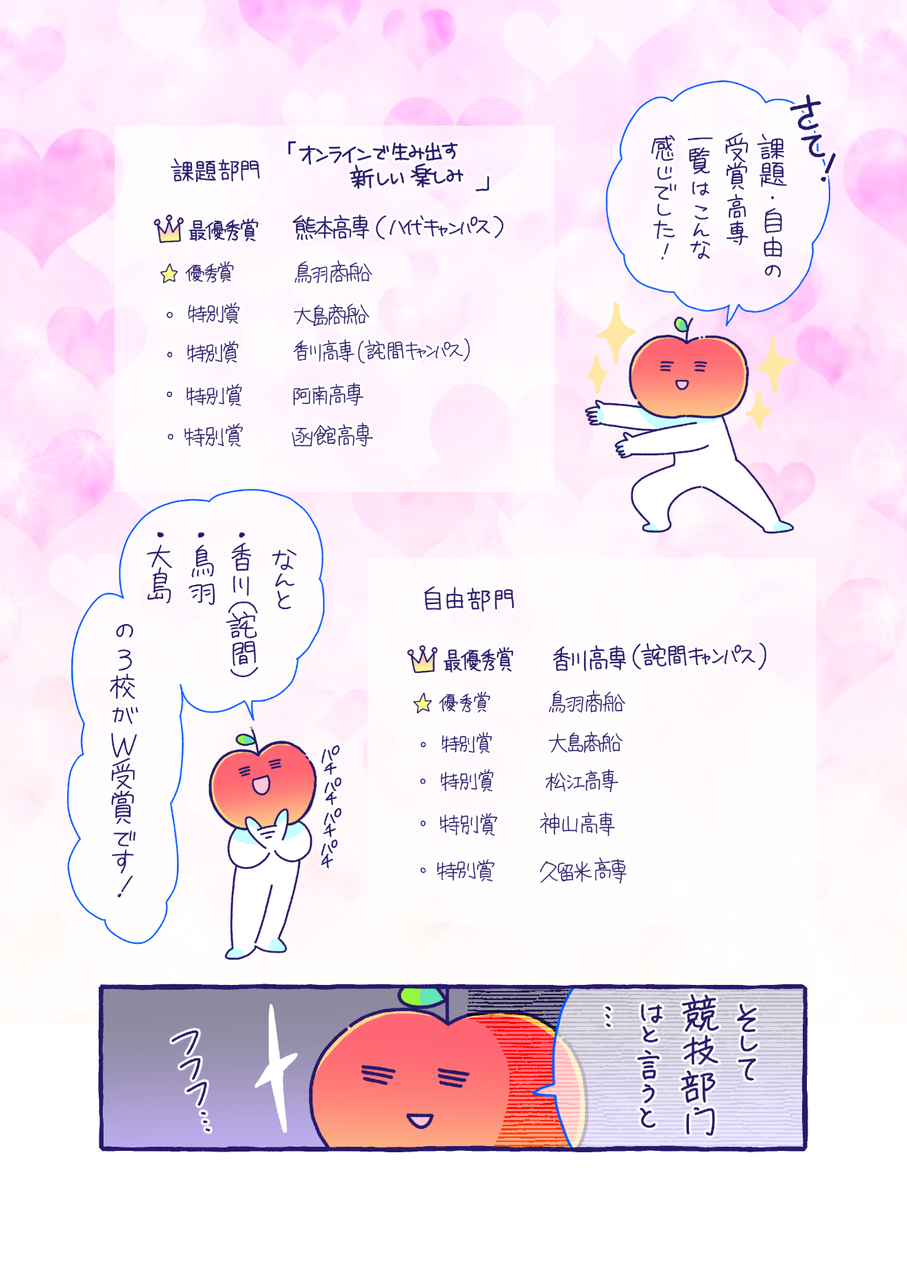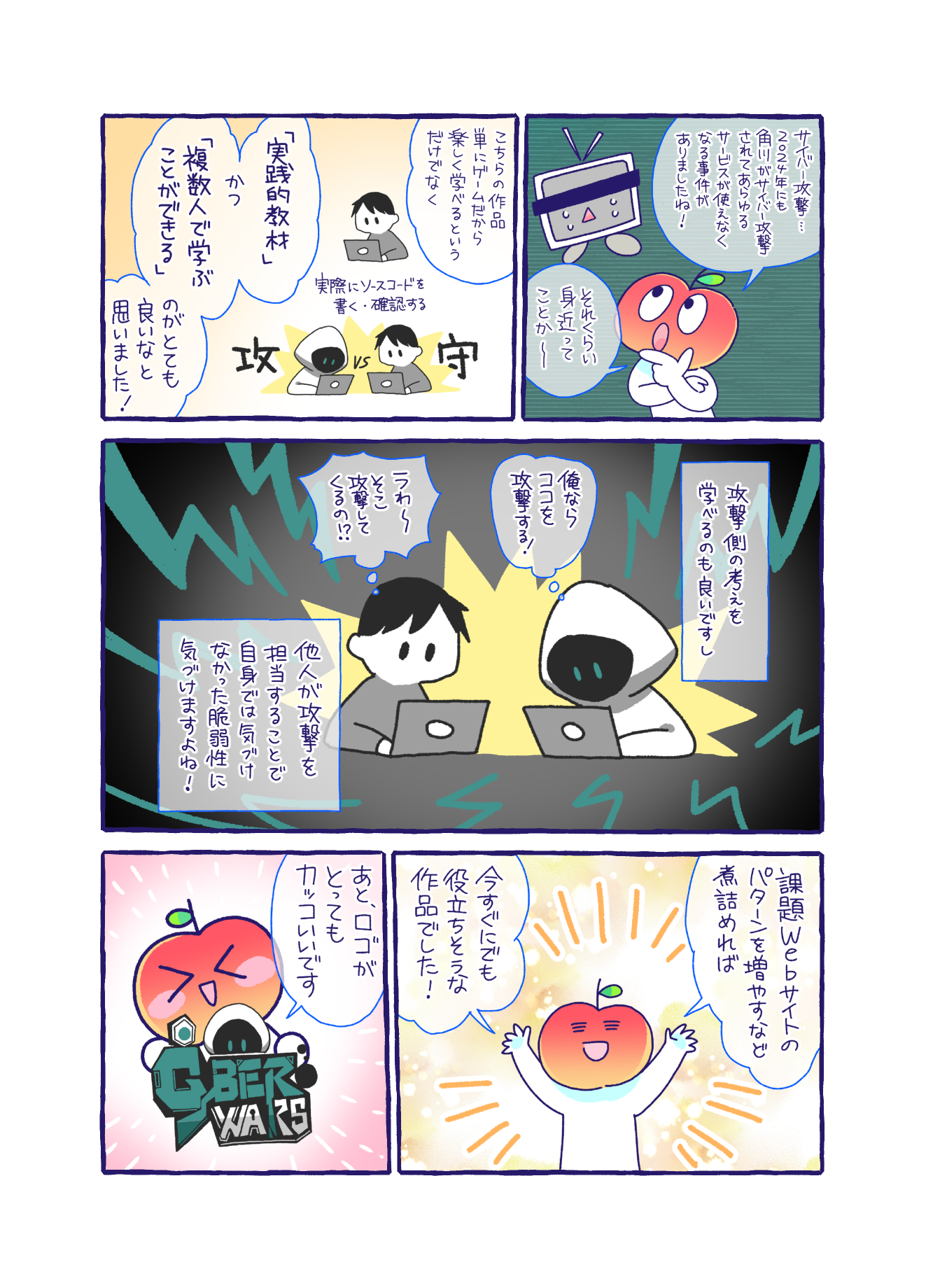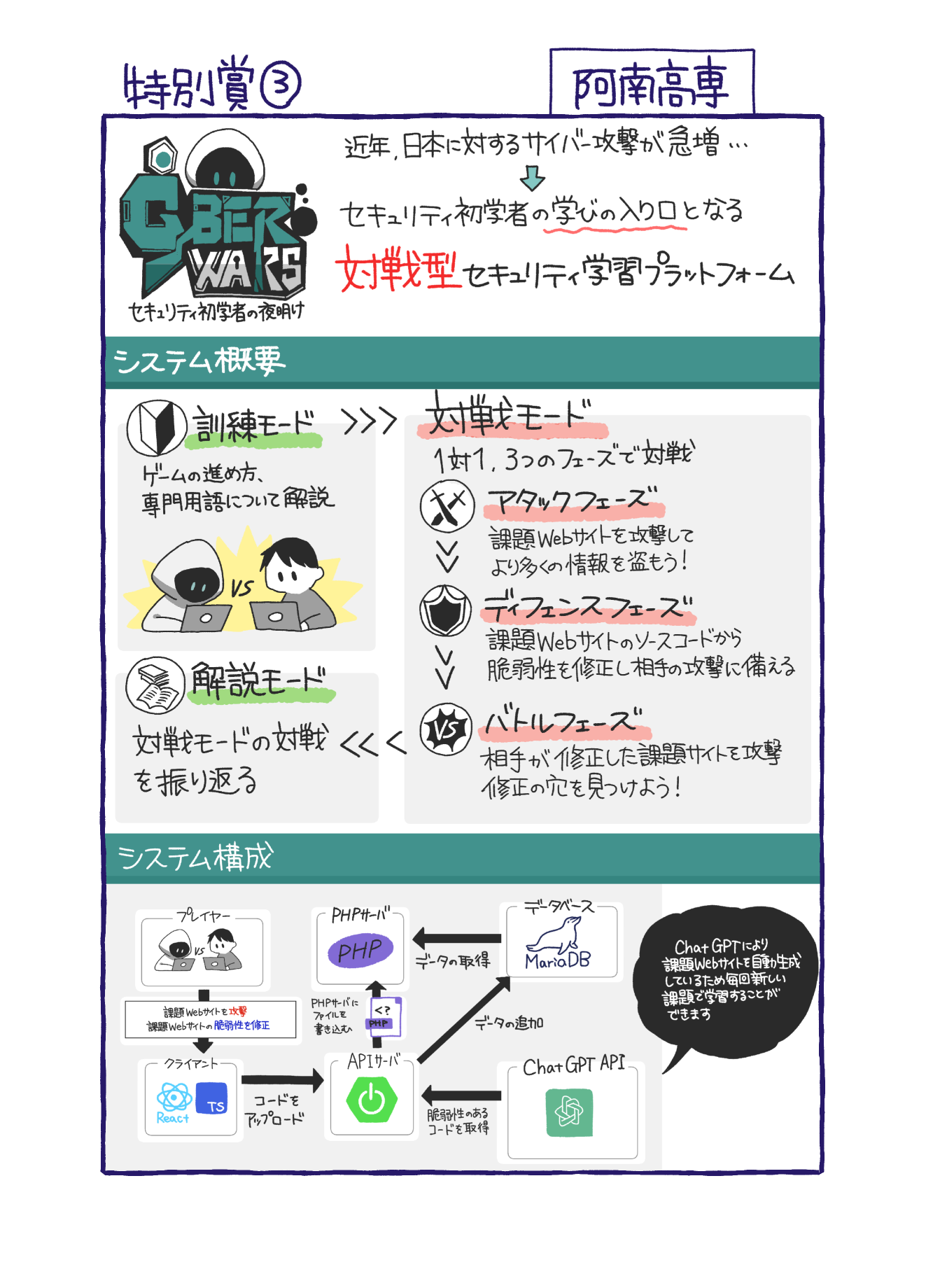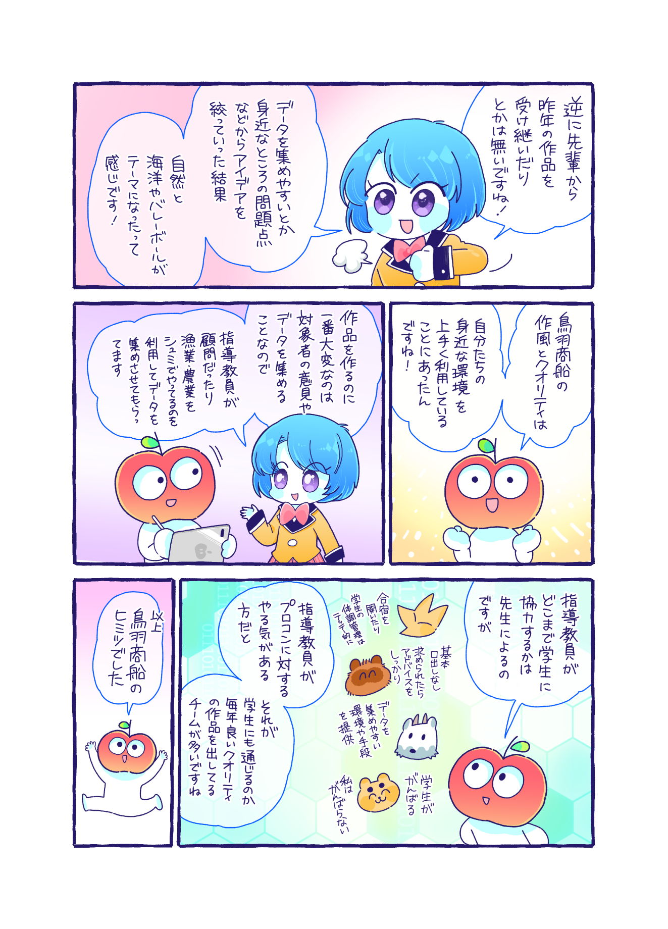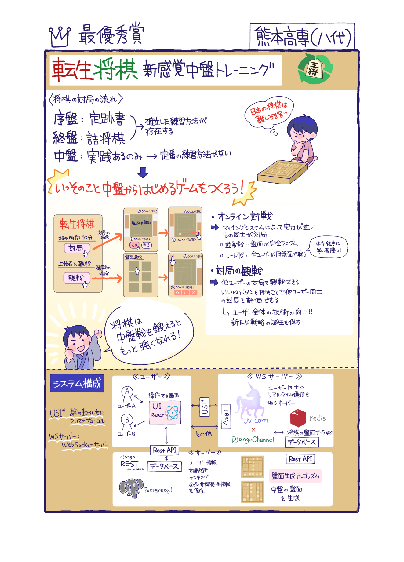 プロコン漫画 トップページ> プロコン漫画 > プロコンレポート2023 第34回福井大会① プロコンレポート2023 第34回福井大会① メッセージ 「おまたせしました。福井大会でのプロコンレポートです。 福井大会は特に作品の特徴が顕著で、AIの使い方が前大会までと大きく変わった年だったことが強く印象に残っております。 そして初めて福井県に私は行ったのですが、プロコン大会後に訪れた眼鏡ミュージアムが大変よい場所だったなということも強く印象に残っております。 1年前の大会のレポートではございますが、「そういえばこんな大会だったナ~」と思い返していただければ幸いです。」